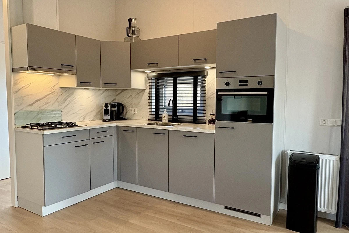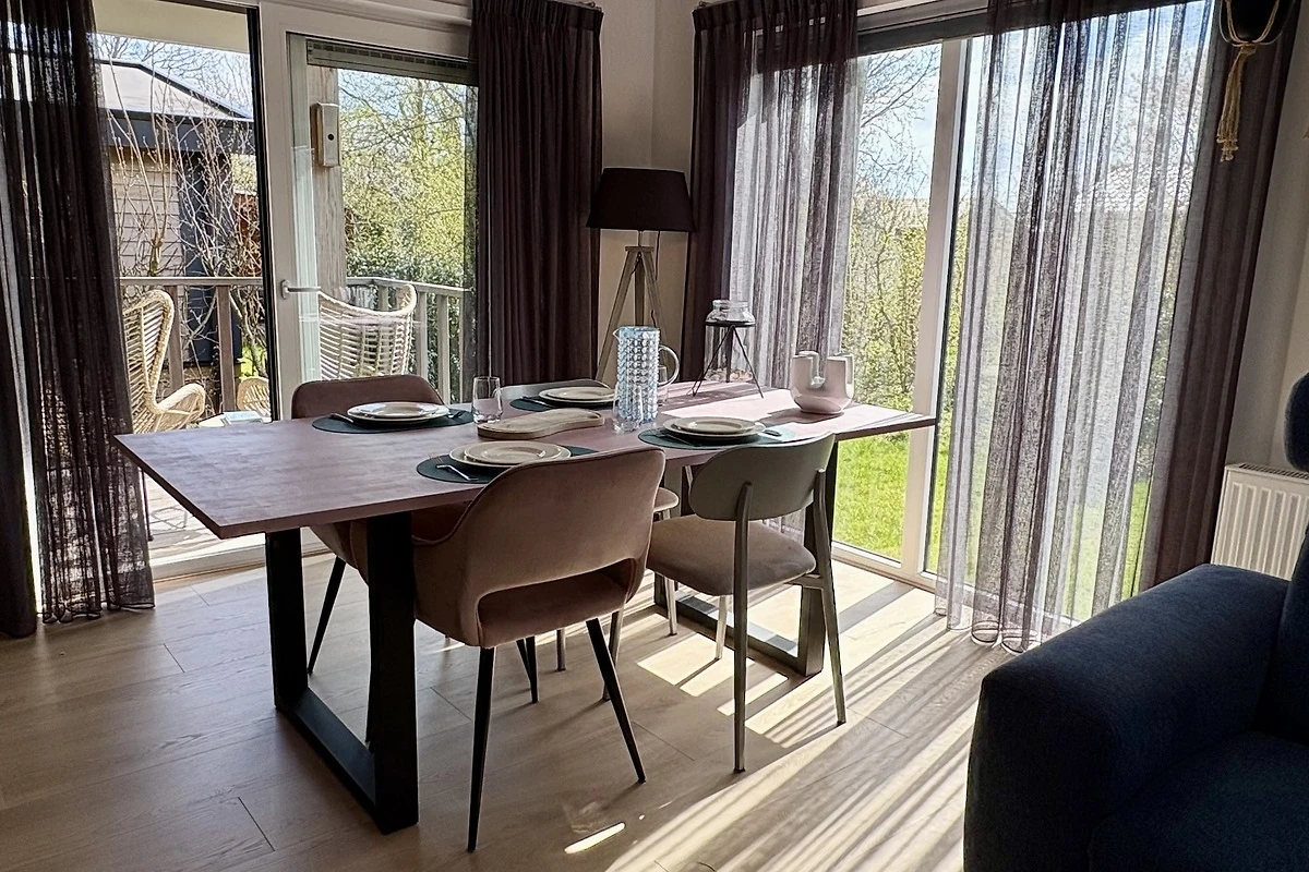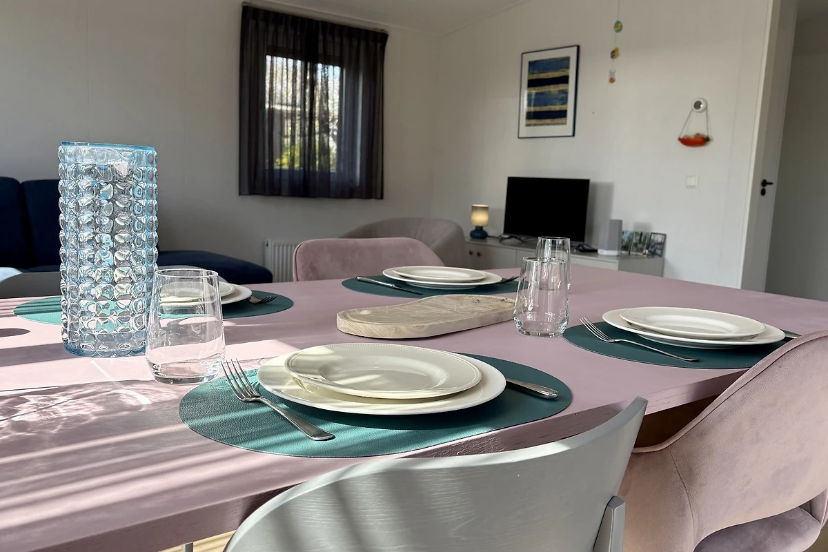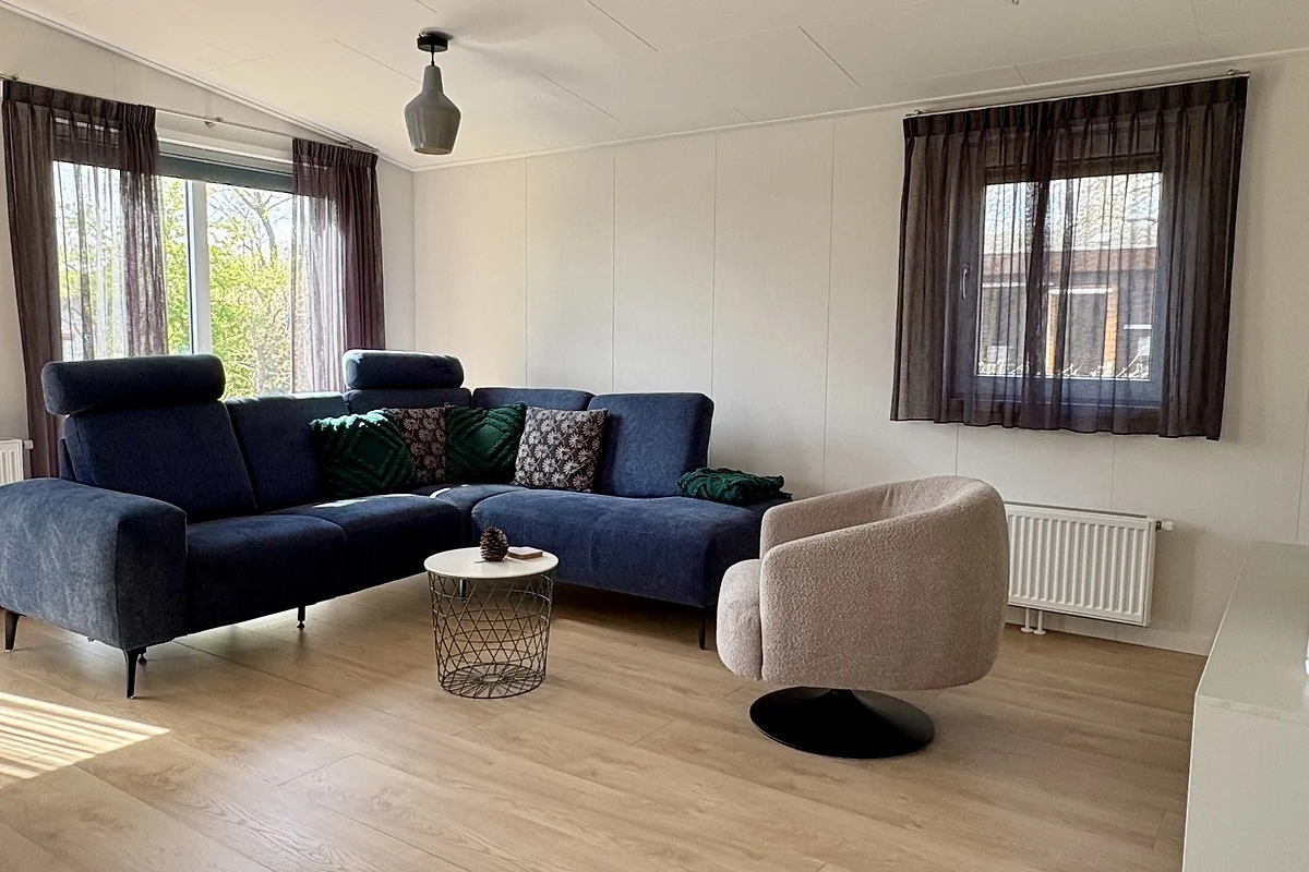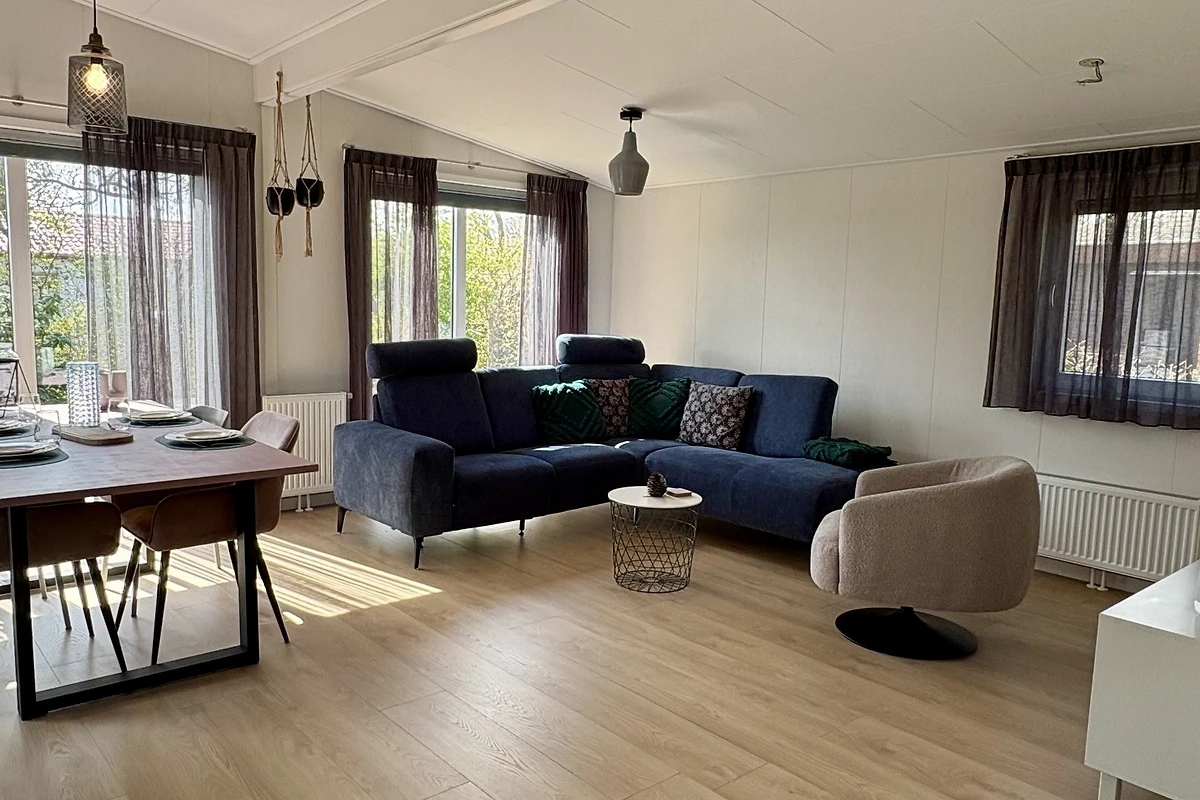 Das gartenorientierte Wohnzimmer ist geräumig und modern eingerichtet, mit einem grossen Ecksofa und einem trendigen Drehsessel, Smart TV mit niederländischen und einigen deutschen Sendern. Es ist mit Laminatboden ausgestattet. Die Küche ist ein Eckschrank, modern im Design und ausgestattet mit einem Gasherd mit Dunstabzugshaube, Kombi-Mikrowelle, Geschirrspüler und Kühlschrank mit Gefrierfach. Es gibt eine gemütliche Essecke mit rechteckigem Tisch und 4 Stühlen.