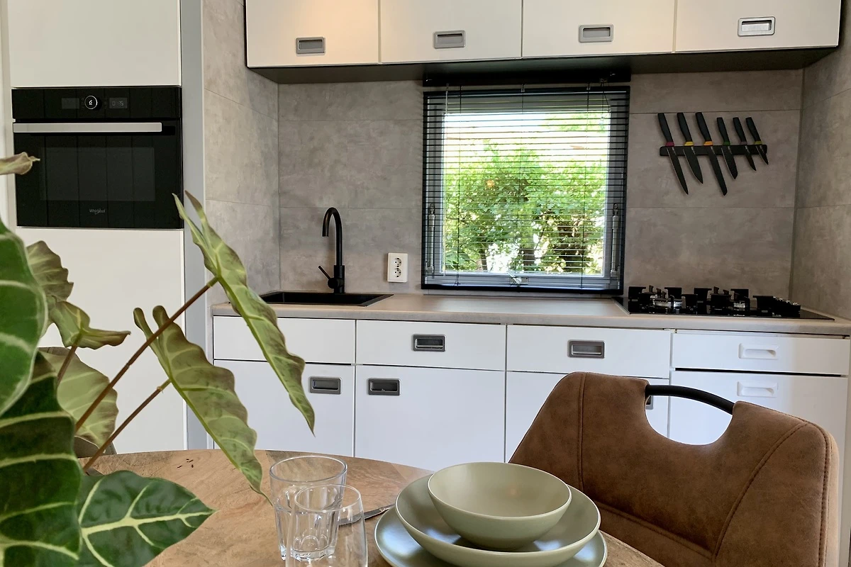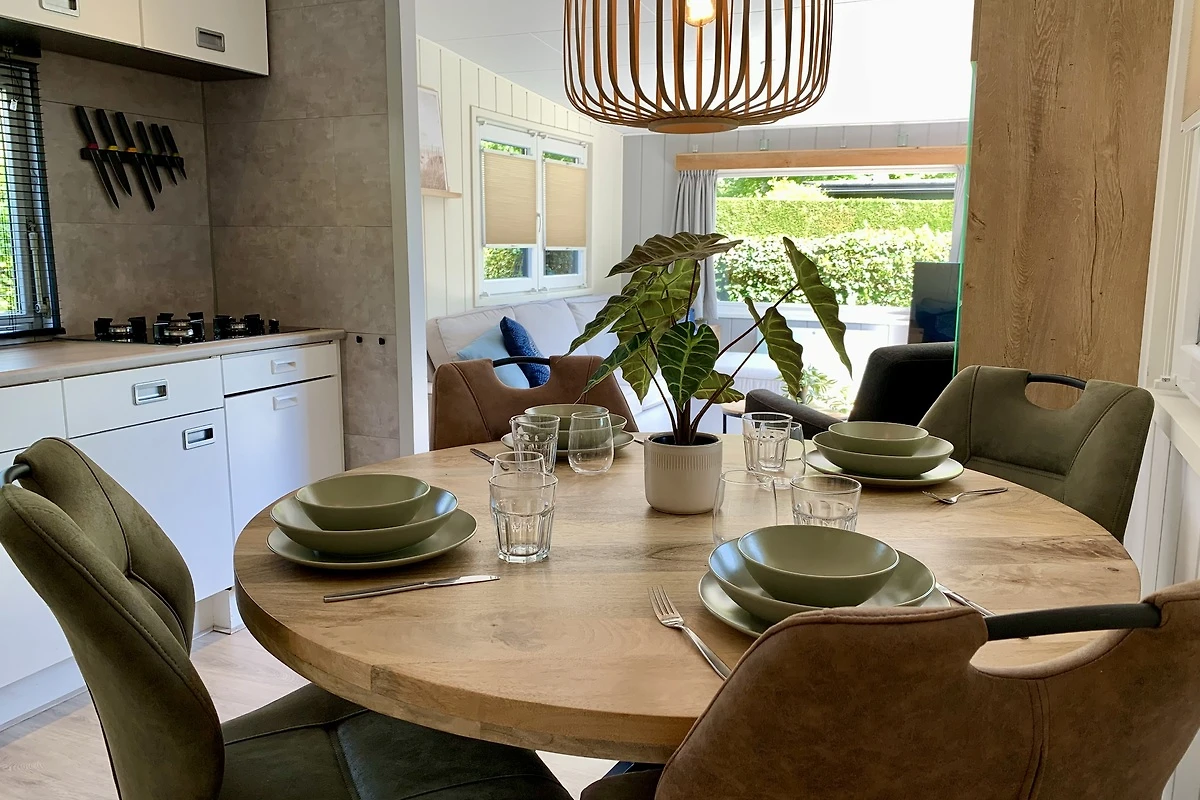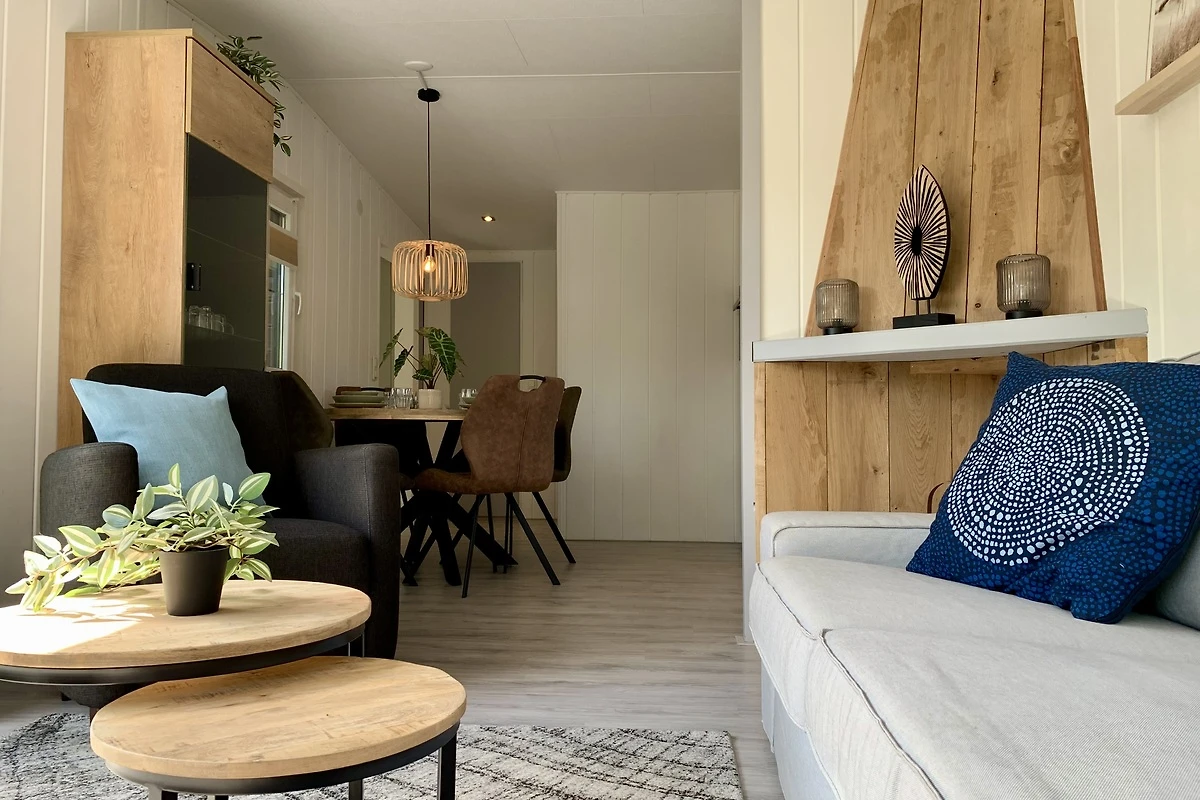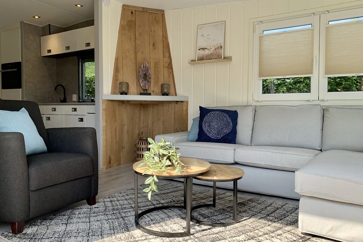 Das geräumige und helle Wohnzimmer ist mit Laminatböden und modernen Möbeln ausgestattet. Von der Sitzecke aus haben Sie einen Blick auf den Garten. Das Wohnzimmer ist mit einem 3-Sitzer-Sofa und einem Sessel ausgestattet. Für kältere Tage gibt es eine elektrische Heizung im Wohnzimmer. Es gibt einen Fernseher mit niederländischen und einigen deutschen Kanälen. Das Chalet verfügt über einen eigenen WiFi-Anschluss (kein Parkinternet).