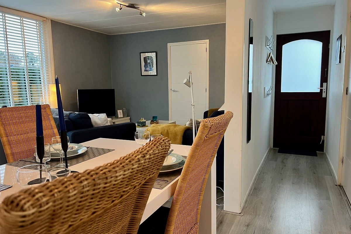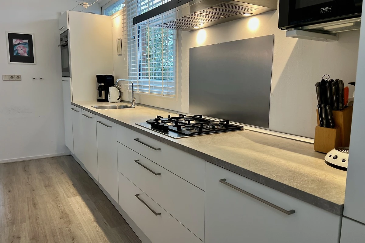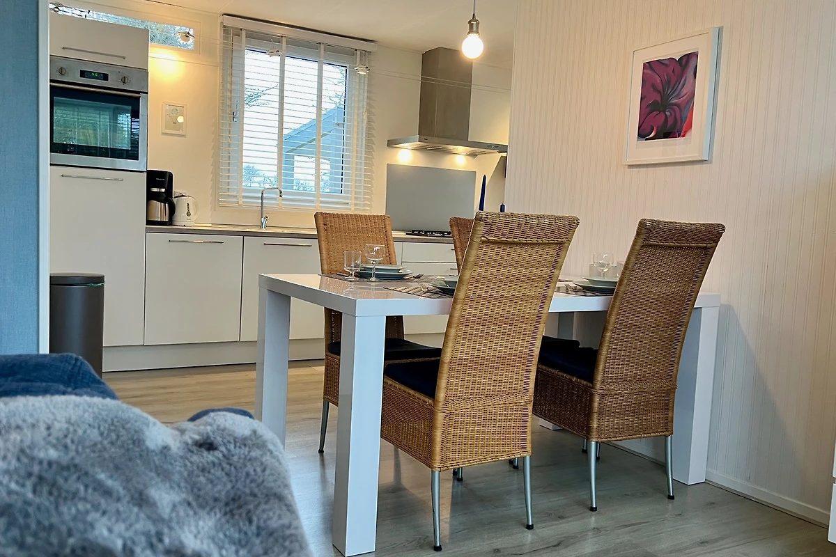 Das geräumige Wohnzimmer mit 3-Sitzer-Sofa, Sessel und Rattanmöbel ist lichtdurchflutet. Es ist mit einem Laminat-Boden ausgestattet. Es gibt einen Smart-TV mit niederländischen und deutschen TV-Kanälen. Die offene Küche ist komplett ausgestattet, darunter ein Gasherd mit Dunstabzugshaube, Geschirrspüler, Kaffeemaschine, Backofen und Mikrowelle, Toaster, Wasserkocher sowie ein grosser Kühlschrank mit 3 Gefrierfächer. Vom Küchentisch aus haben Sie im Frühling einen schönen Blick auf die Blumenzwiebelfelder.