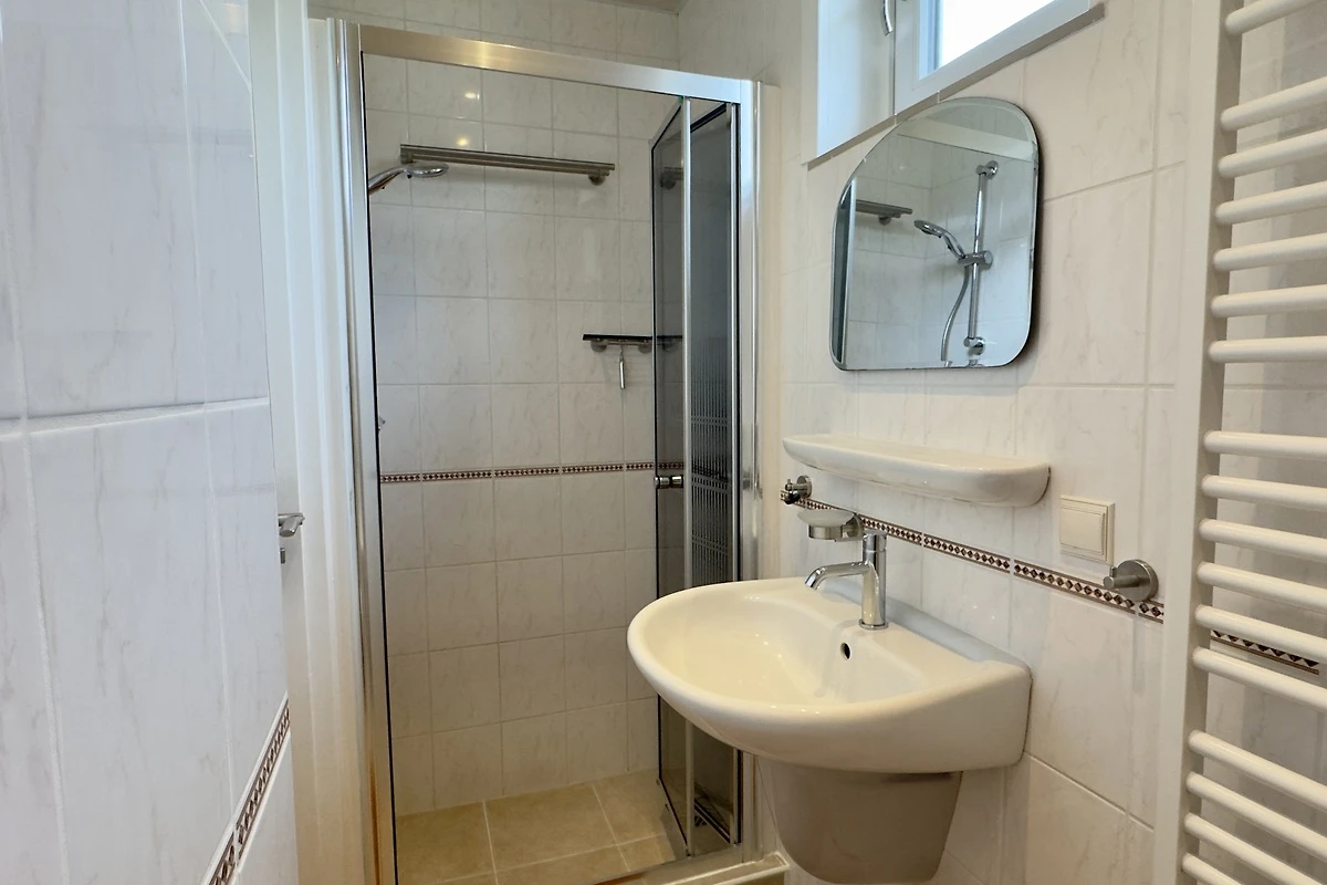 Einfache Badezimmer mit Dusche, WC und Waschbecken