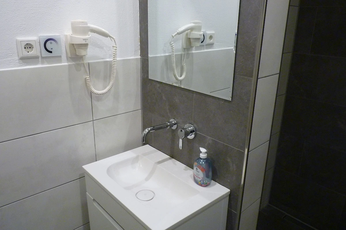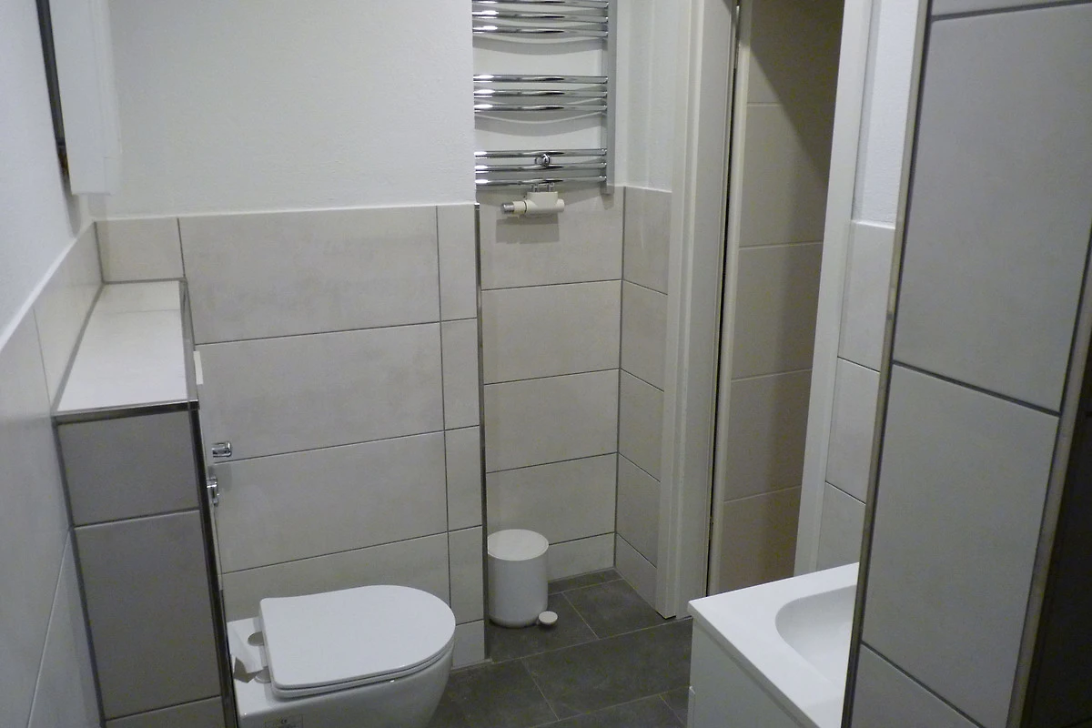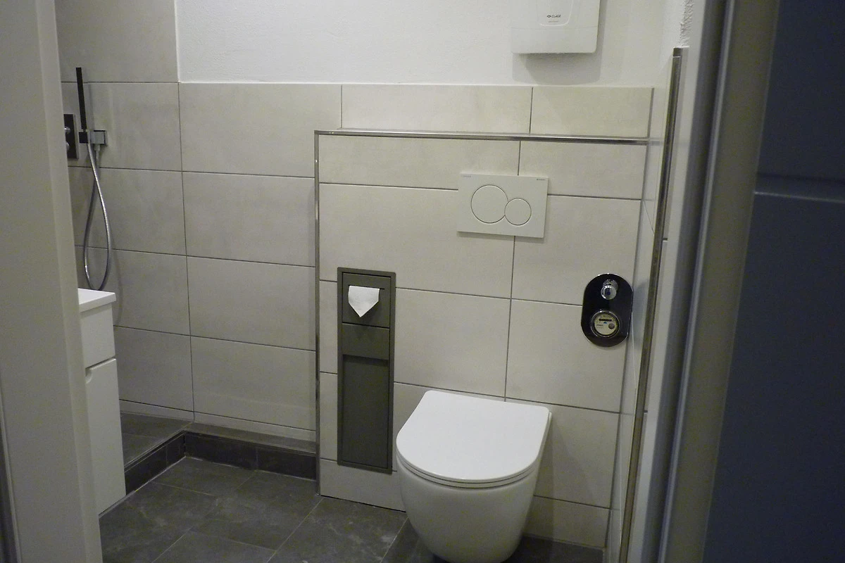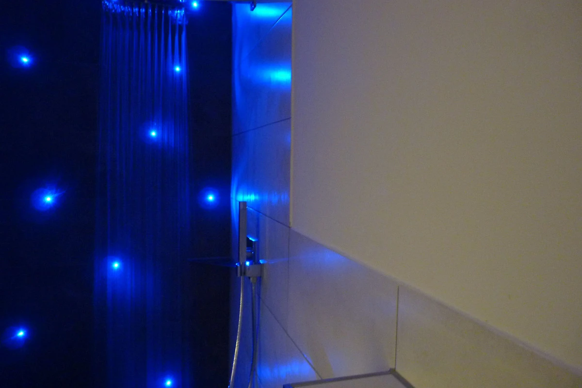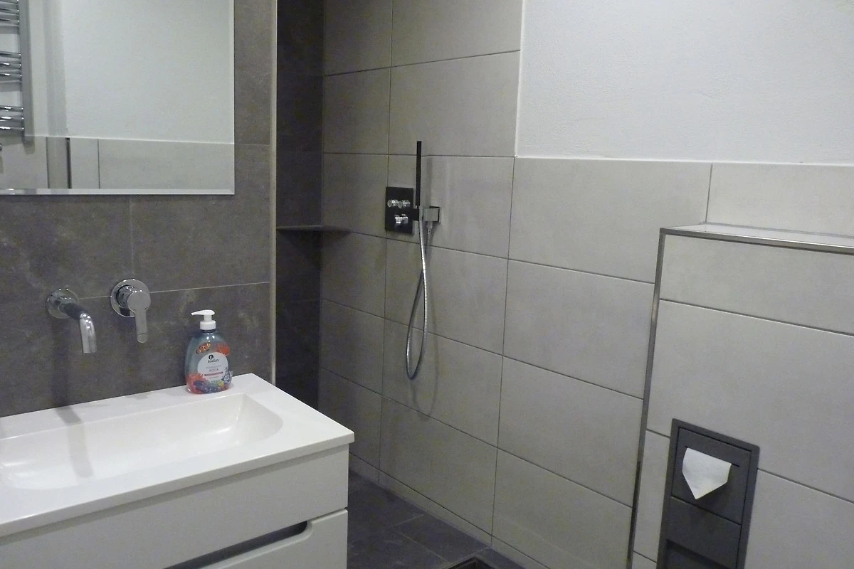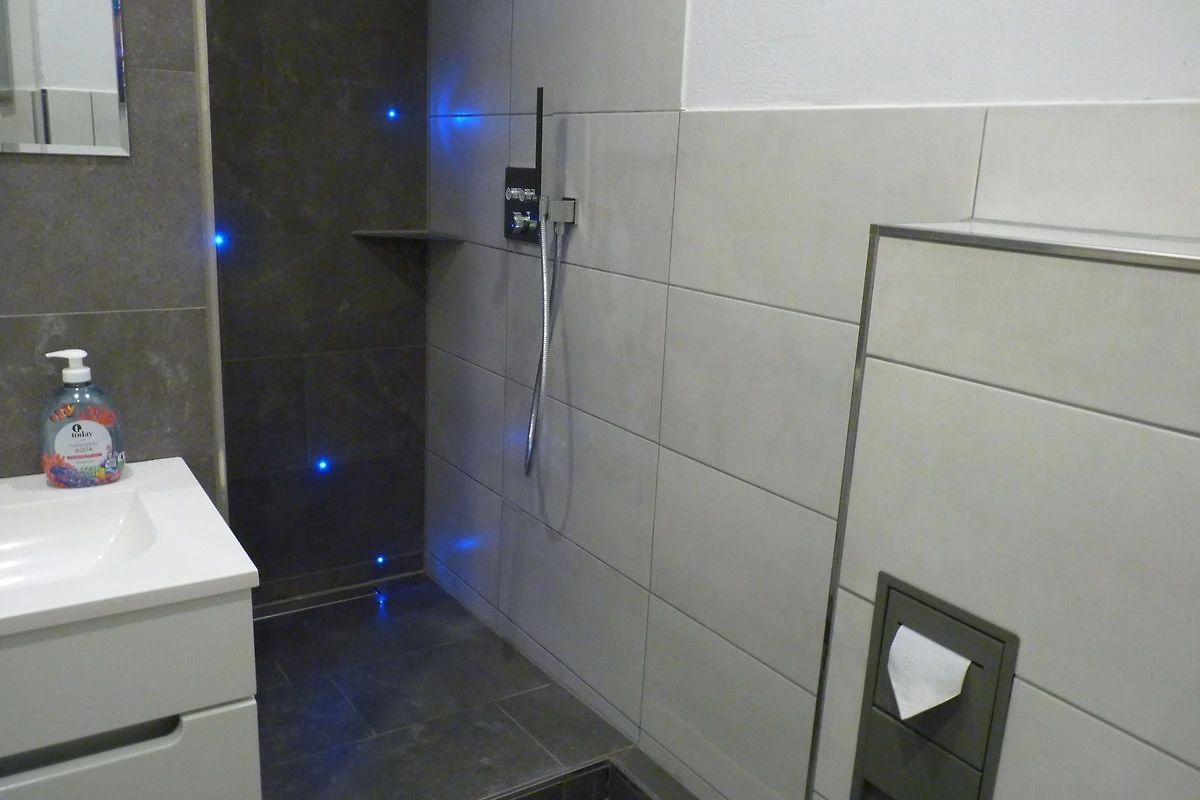 Im Badezimmer befindet sich eine schöne große Regen-Dusche. Auch hier kann durch eine dimmbare Beleuchtung in den Fugen der Fliesen ein schönes Ambiente erzeugt werden.