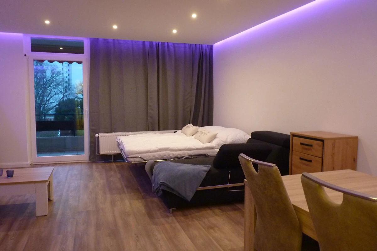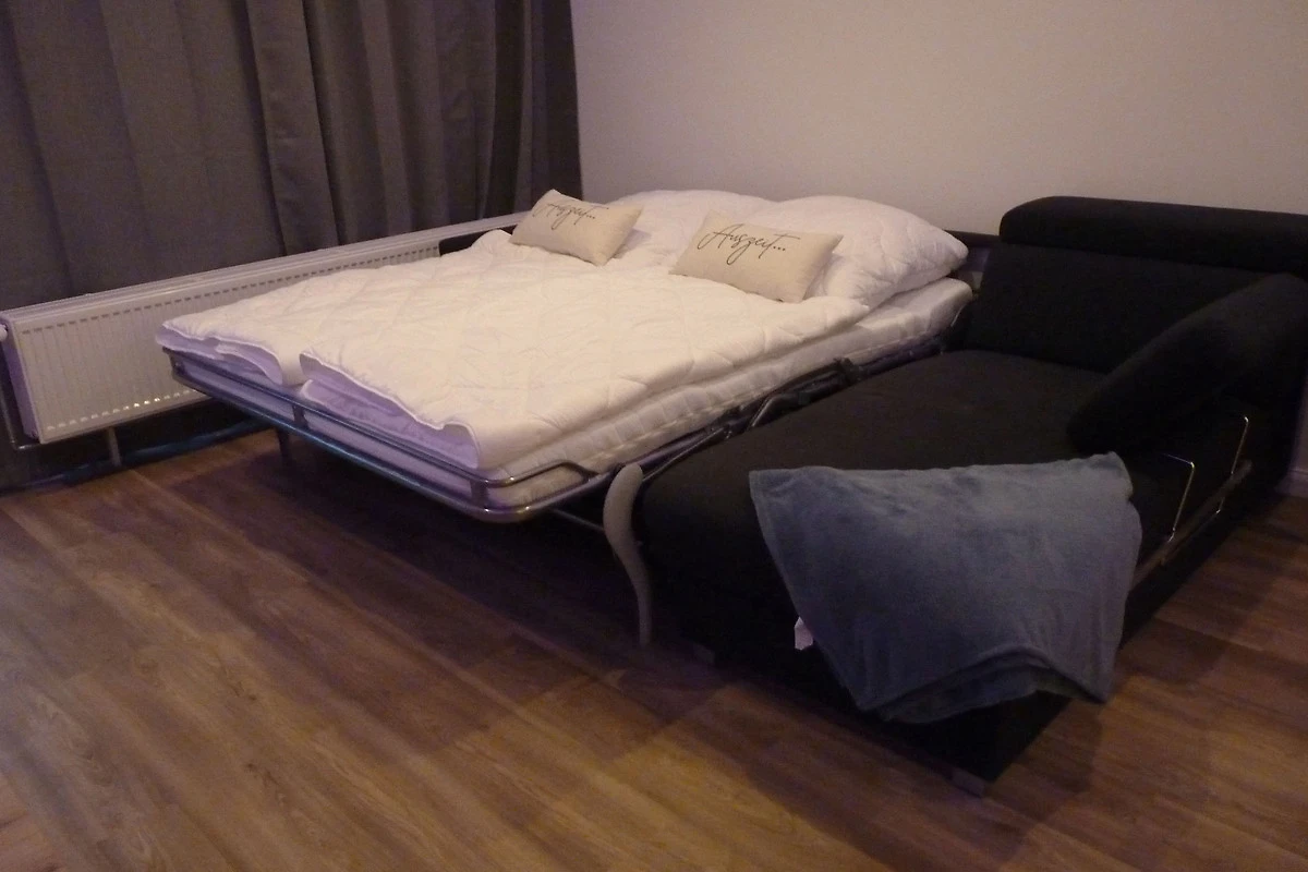 Im Wohnzimmer ist neben der offenen Küche ebenfalls ein 52 Zoll Flatscreen vorhanden, welcher vom besonders hochwertigen Dauerschläfer Sofa mit 180 x 200m Matratze wunderbar zu genießen ist.