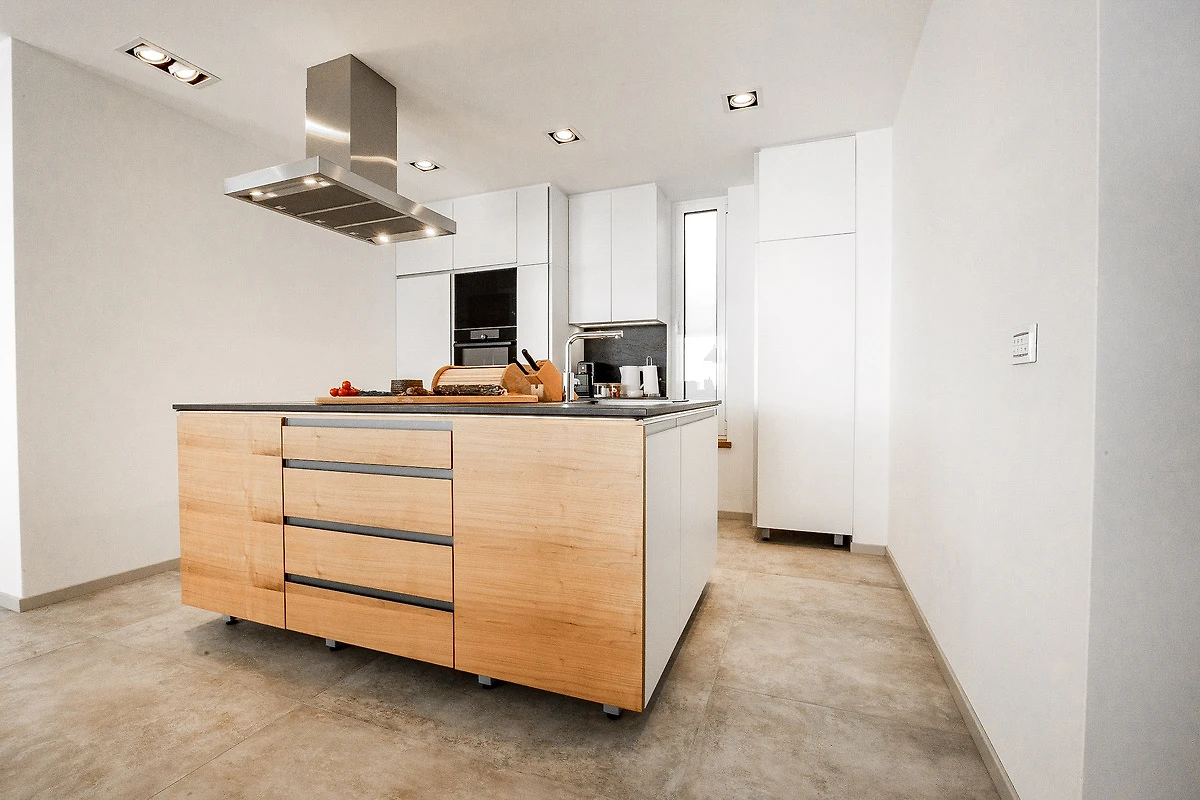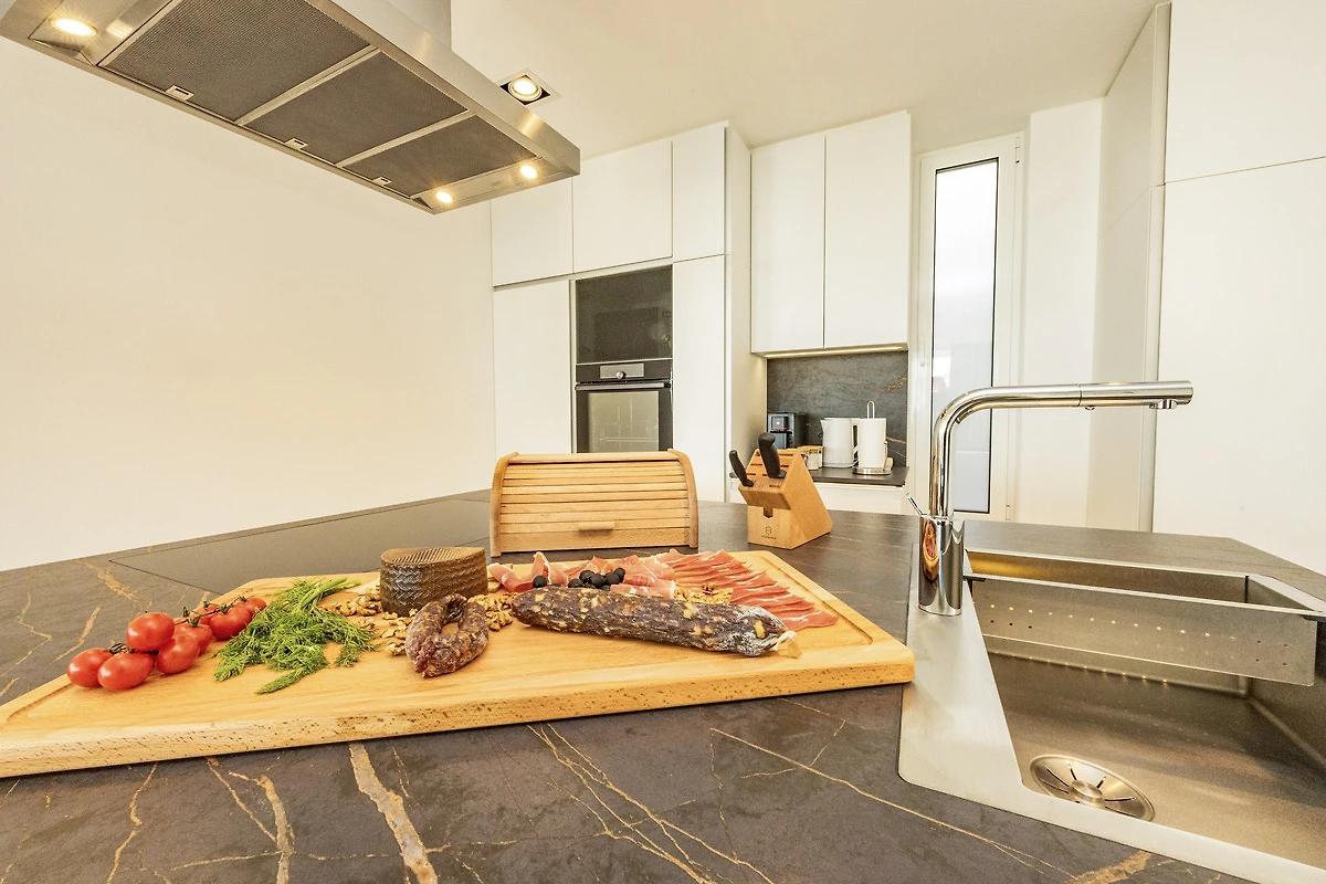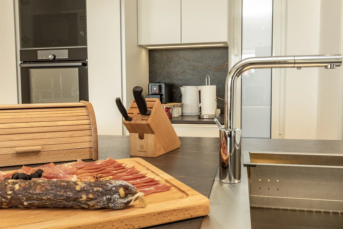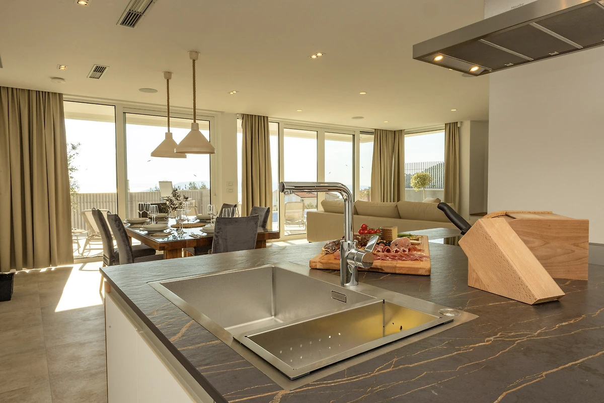 Die moderne, offene Küche mit Kochinsel ist vollständig ausgestattet – ideal für Gäste, die gerne kochen und kulinarische Genüsse zubereiten möchten.