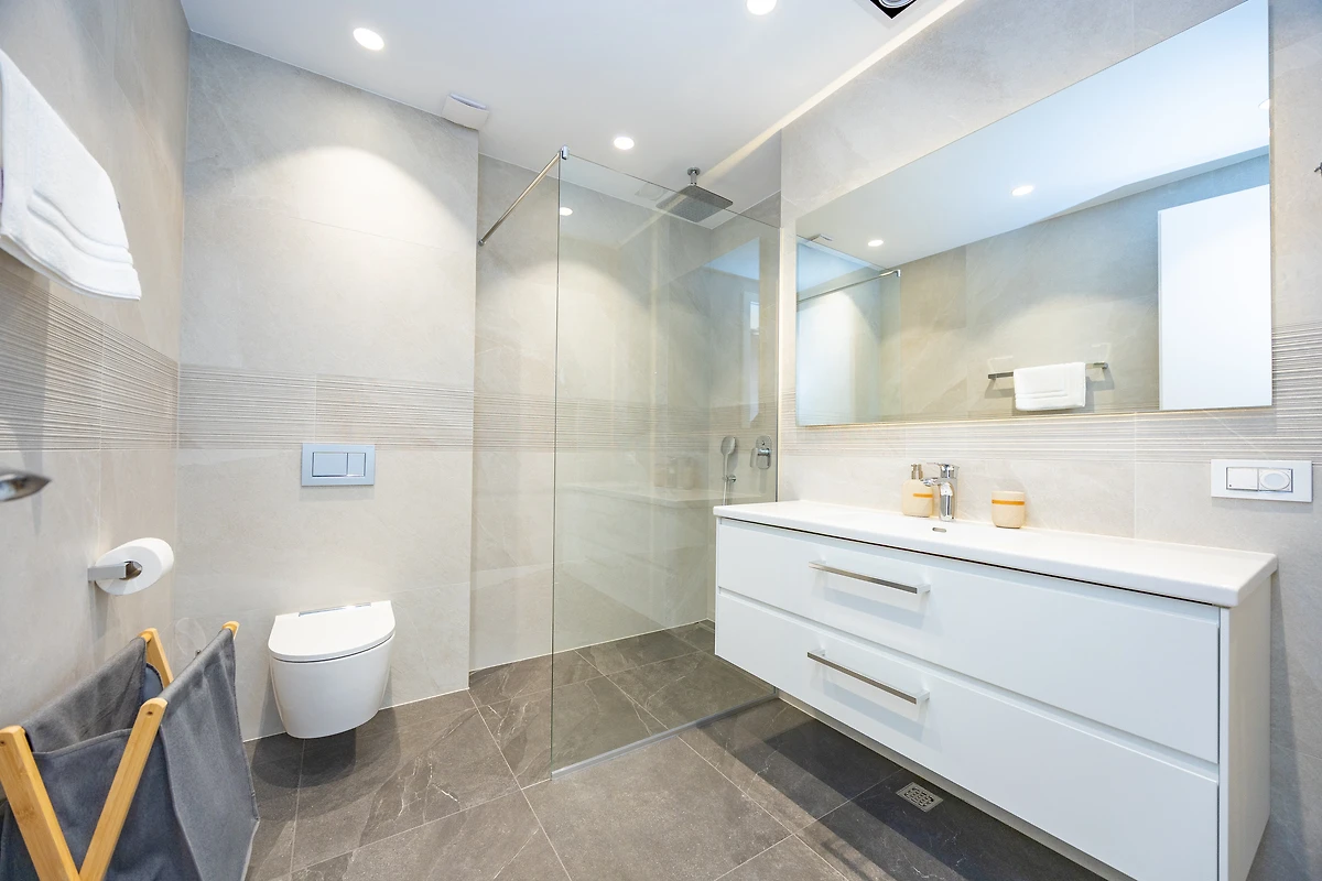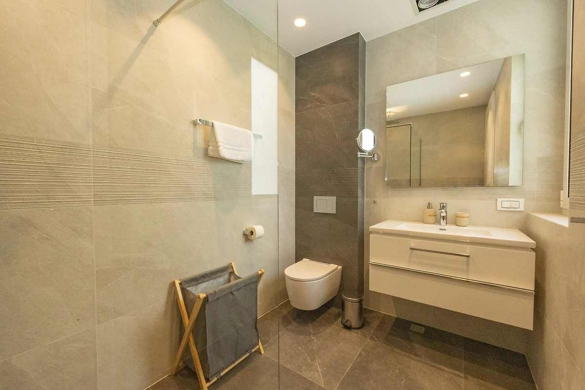 Die Wohnung bietet drei großzügige Schlafzimmer mit komfortablen Doppelbetten (180 x 200 cm) sowie drei moderne En-suite-Badezimmer. Der helle, offene Wohn- und Essbereich mit Smart-TV lädt zum Entspannen ein.
