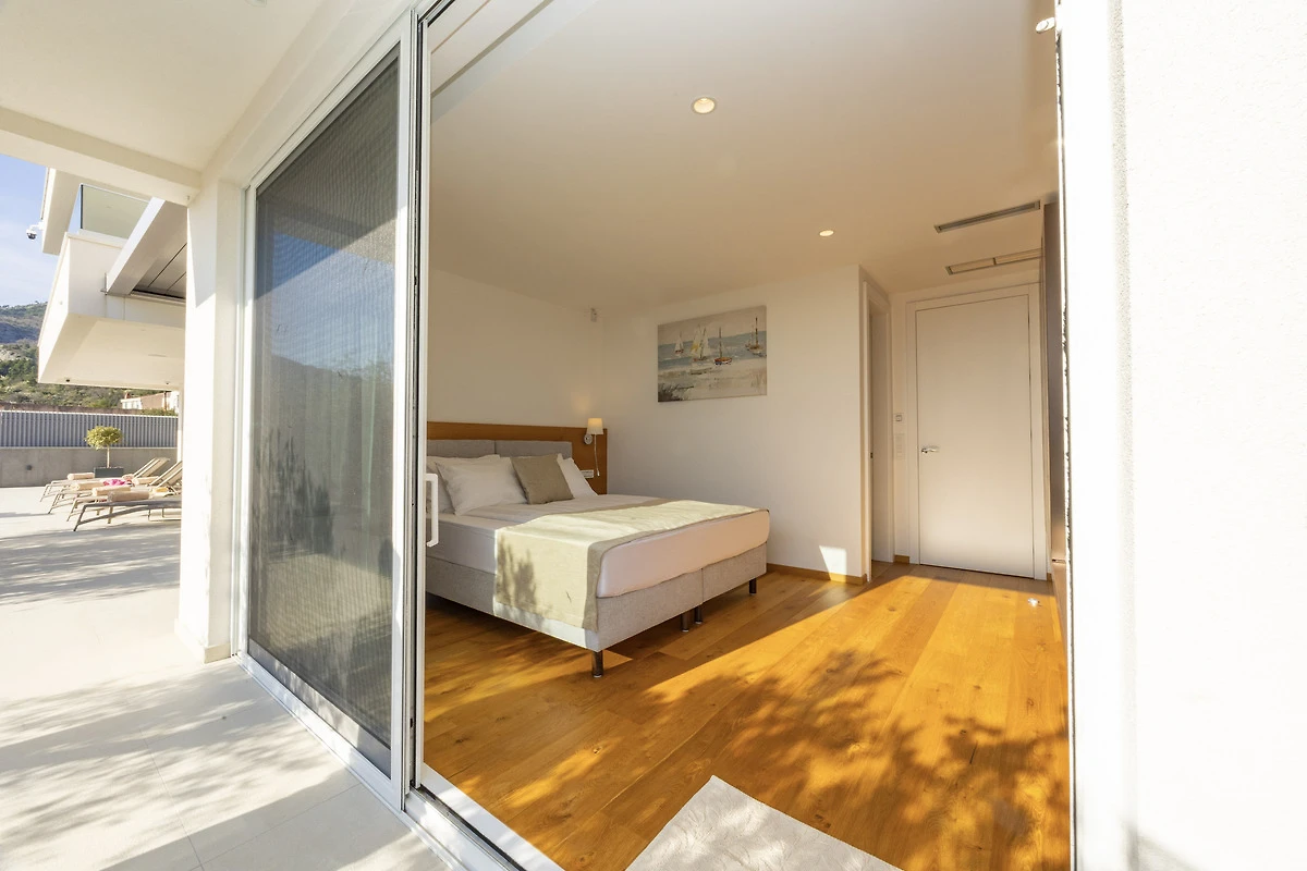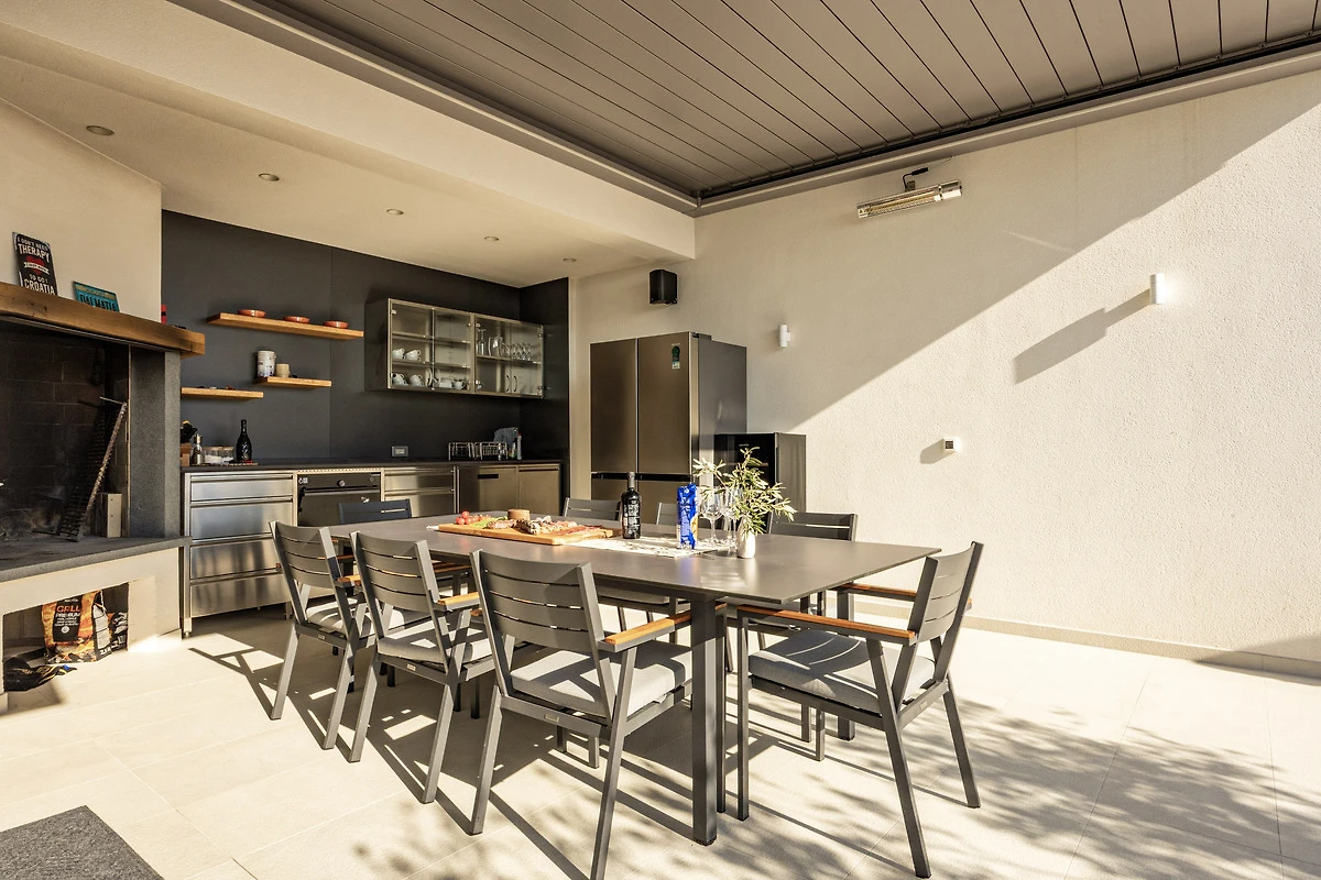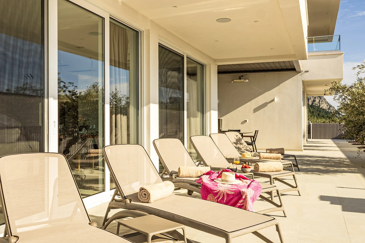 Vom Wohnbereich gelangen Sie direkt auf die großzügige Poolterrasse, das Herzstück der Unterkunft. Genießen Sie den privaten, beheizten Salzwasserpool, bequeme Liegestühle und eine stilvolle, gemütliche Atmosphäre. Zwei Schlafzimmer haben ebenfalls direkten Zugang zur Terrasse und zum Poolbereich.