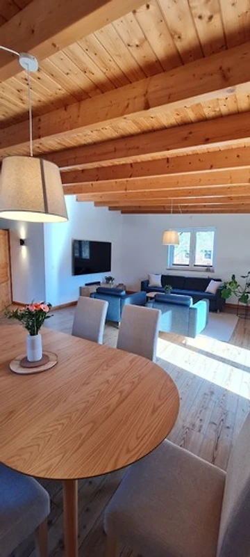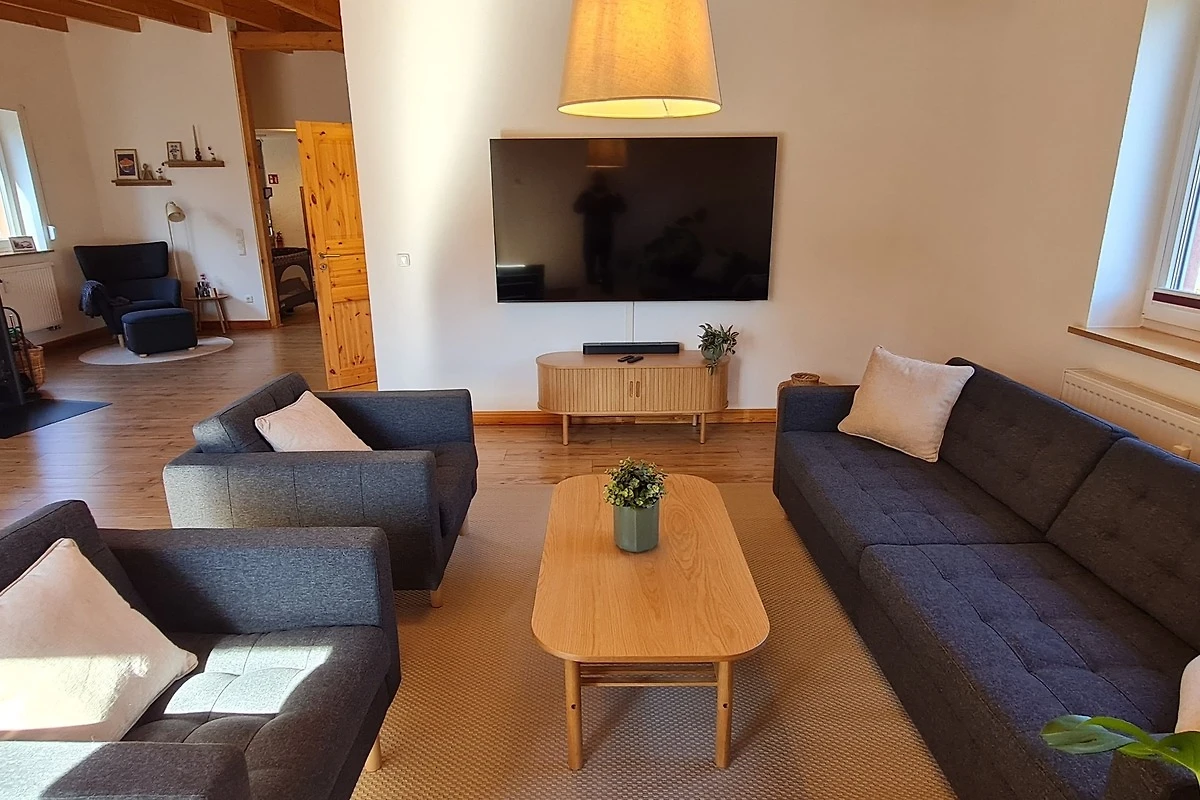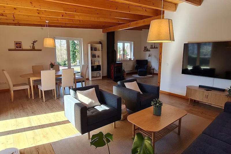 Der grosszügige Wohn- und Essbereich lädt zum Wohlfühlen ein. Ein Ofen sorgt für gemütliche Wärme, in der Leseecke können Sie entspannen und der Wohnbereich mit TV bietet zusätzlichen Komfort - auf Anfrage kann das Sofa auch als Schlafsofa genutzt werden.