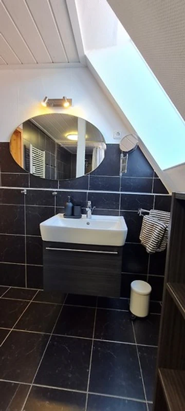 Das Badezimmer bietet eine moderne Dusche und ausreichend Platz für alles, was Sie während Ihres Aufenthalts benötigen.