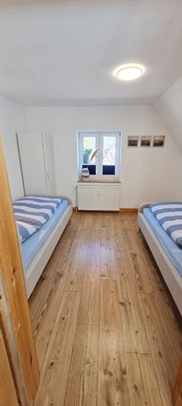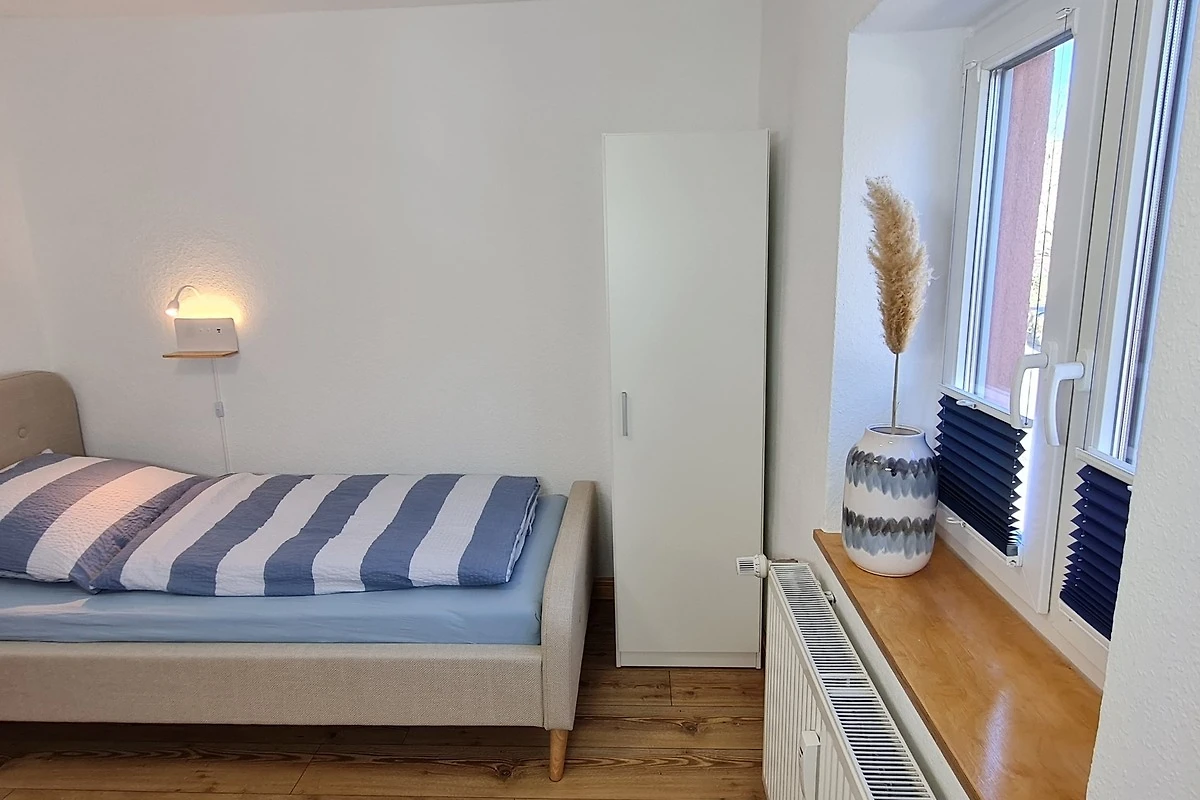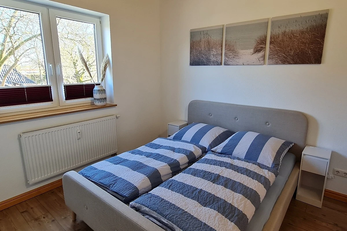 Die Ferienwohnung bietet mit zwei gemütlichen Schlafzimmern Platz für bis zu 4 Personen. Ein Zimmer ist mit einem Doppelbett und Kleiderschrank ausgestattet, das zweite mit zwei Einzelbetten und ebenfalls einem Schrank.