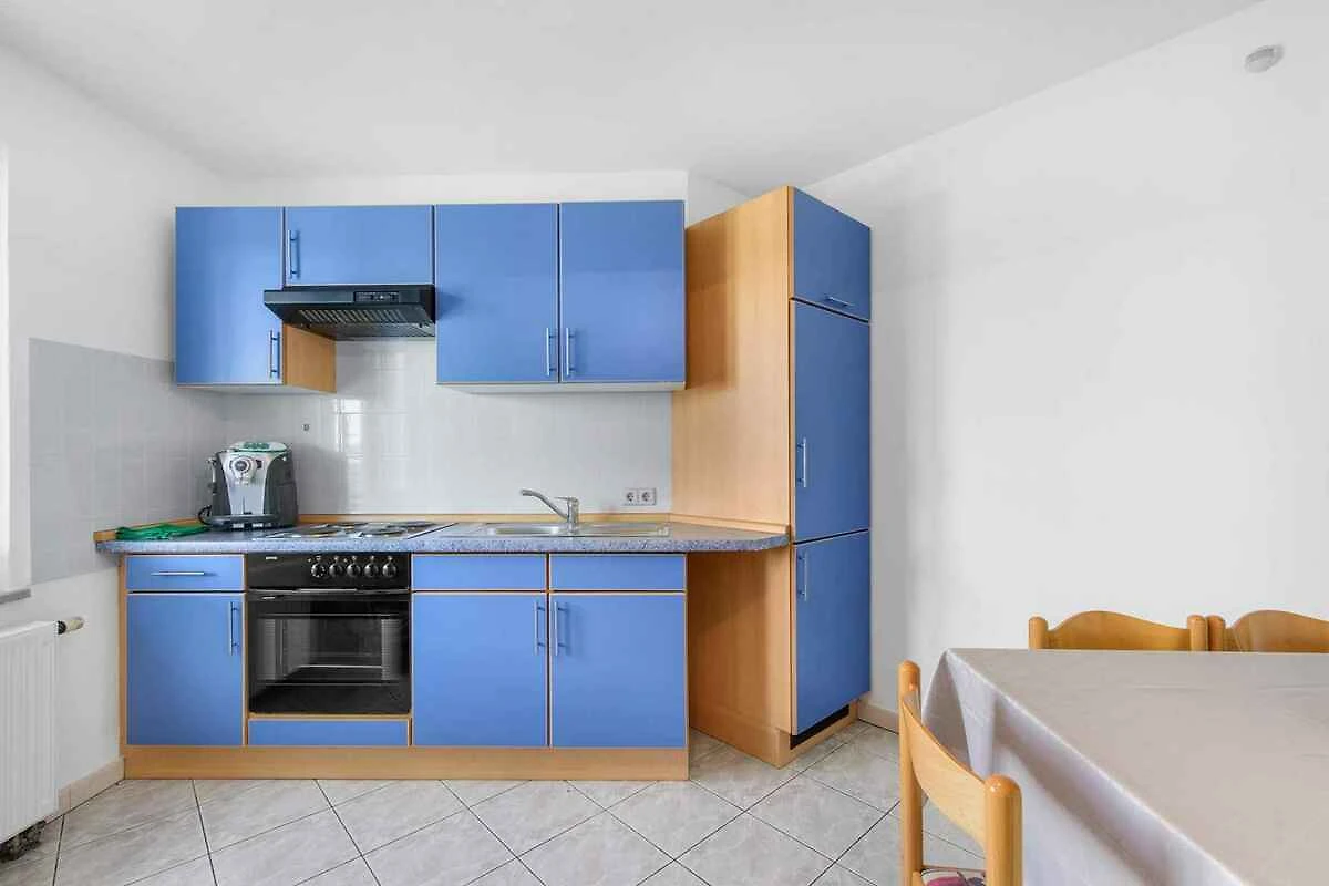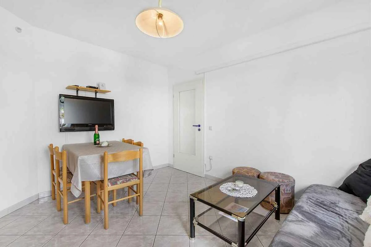 Das Apartment verfügt über zwei Schlafzimmer und ein Zustellbett, ideal für Paare oder kleine Familien. Die offene Küche ist komplett ausgestattet und bietet ausreichend Platz für gemeinsame Mahlzeiten.