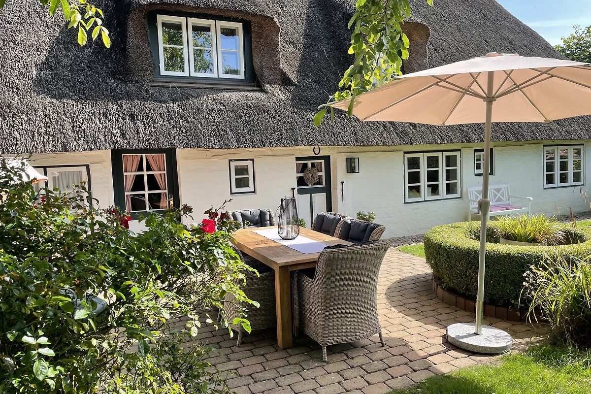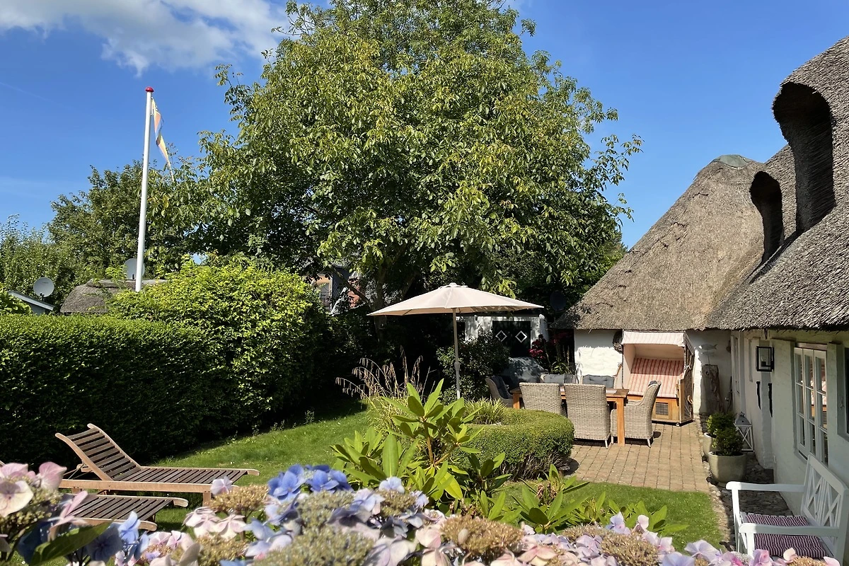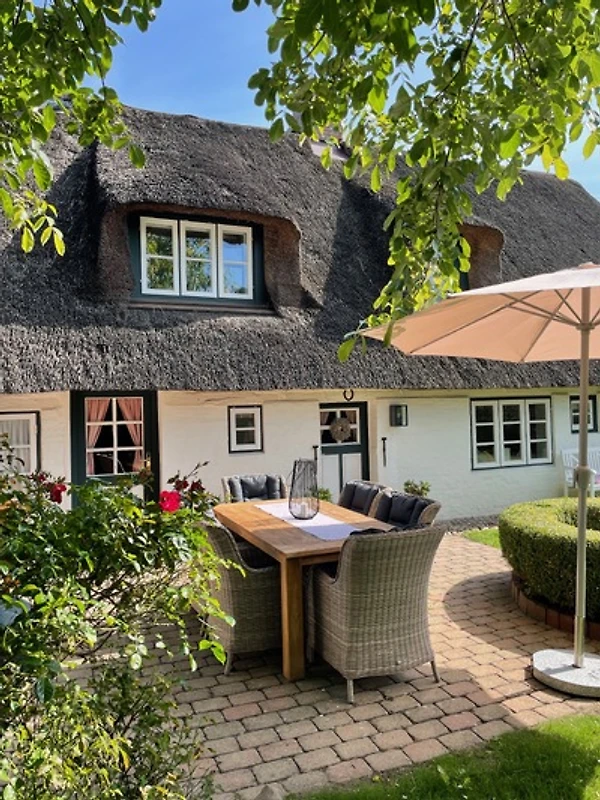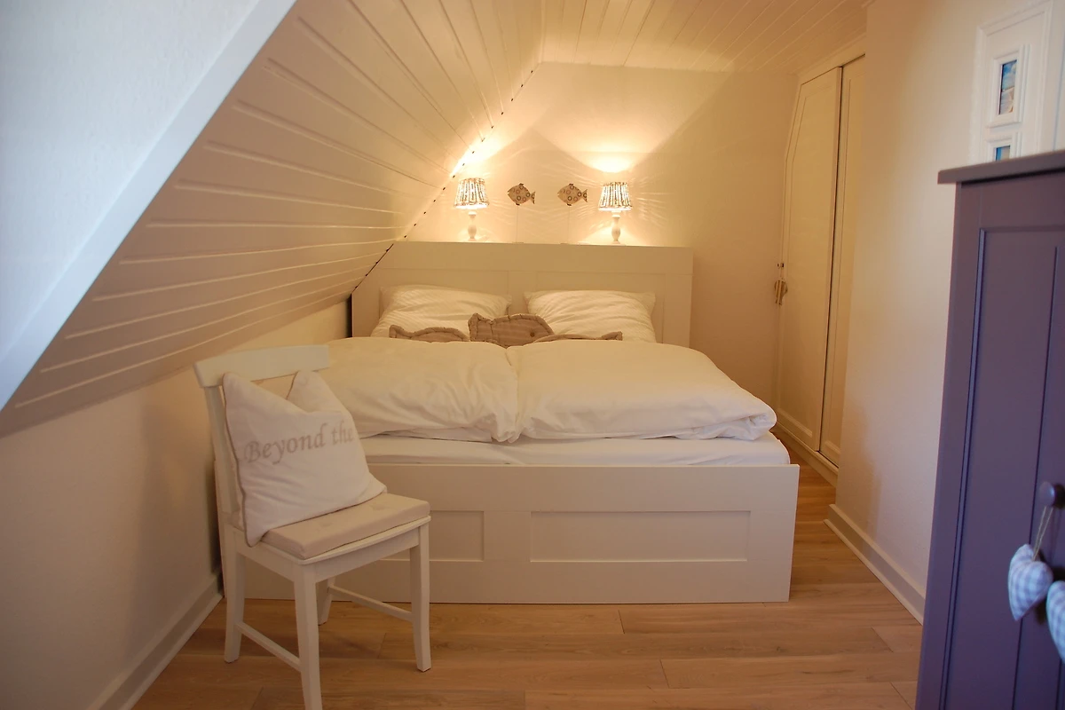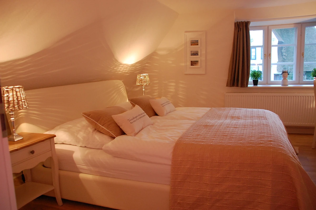 Wyk begeistert mit Sandstrand, Promenade und direktem Blick auf die Nordsee. Friesisches 5-Sterne Reetdachhaus aus dem Jahre 1850 mit original historischem Alkoven und typisch für historische Reetdachhäuser niedrigen Decken.