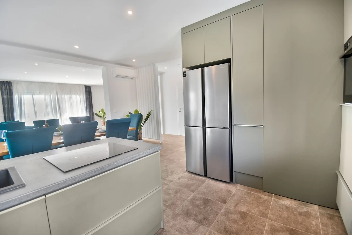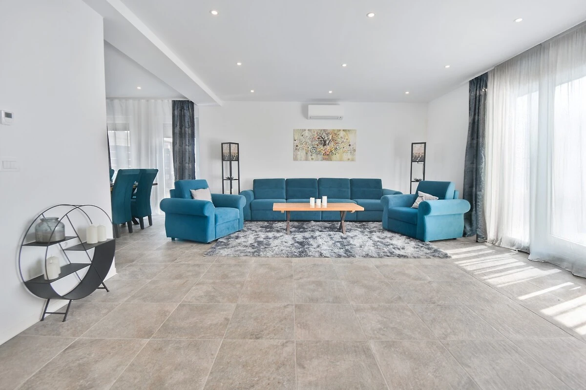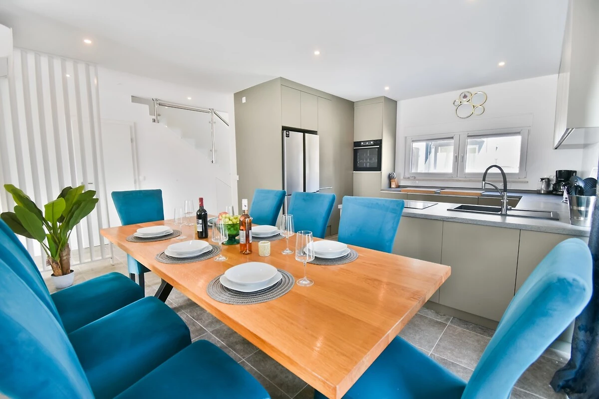 Es handelt sich um eine Duplex-Villa, wobei eine Haushälfte vermietet wird und den Gästen vollständige Privatsphäre garantiert. Die Villa bietet Platz für bis zu 6 Personen, und für größere Gruppen können auf Anfrage beide Einheiten zusammen gebucht werden.
