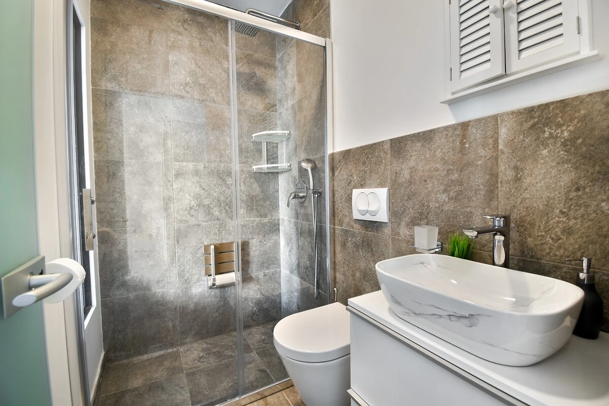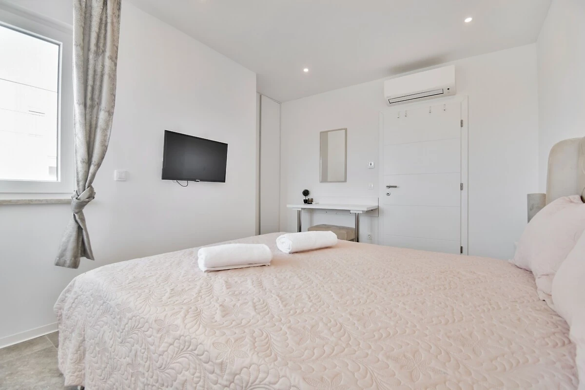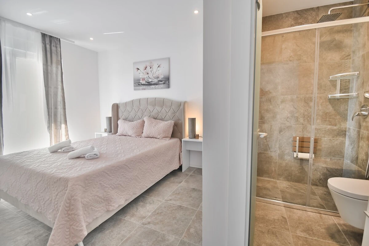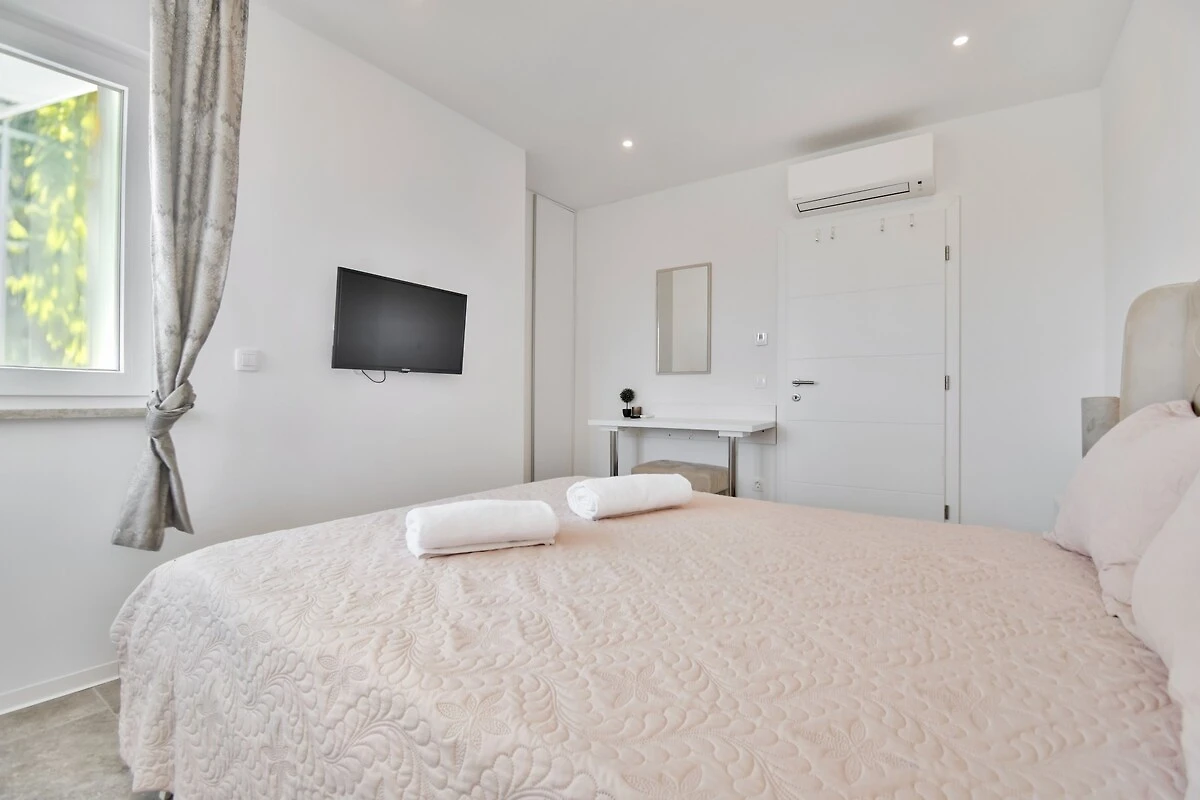 Im ersten Stock befinden sich drei Schlafzimmer mit großen Doppelbetten. Alle Zimmer sind klimatisiert und mit einem TV ausgestattet, während ein Schlafzimmer über ein eigenes Badezimmer verfügt. Zusätzlich gibt es auf dieser Etage ein weiteres Badezimmer. Zwei Schlafzimmer haben Zugang zu einem gemeinsamen Balkon, perfekt für einen Kaffee am Morgen mit schöner Aussicht.