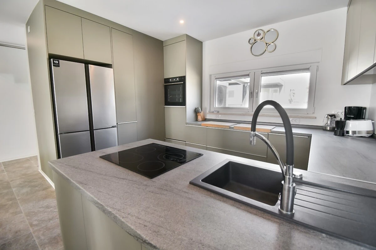 Im Erdgeschoss befinden sich ein geräumiges Wohnzimmer, eine moderne und voll ausgestattete Küche, ein Essbereich sowie ein Badezimmer. Der Raum ist hell und gemütlich und ideal zum gemeinsamen Verweilen.