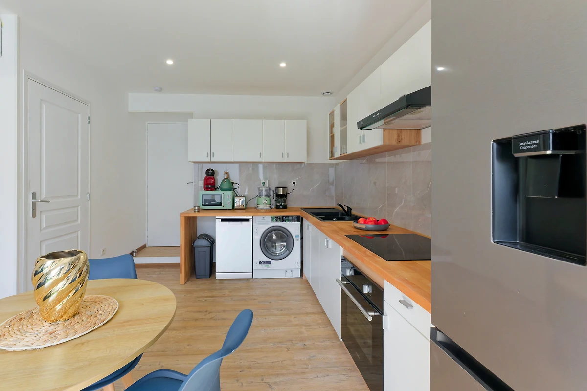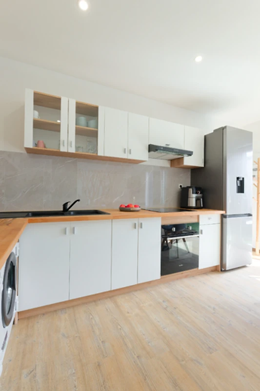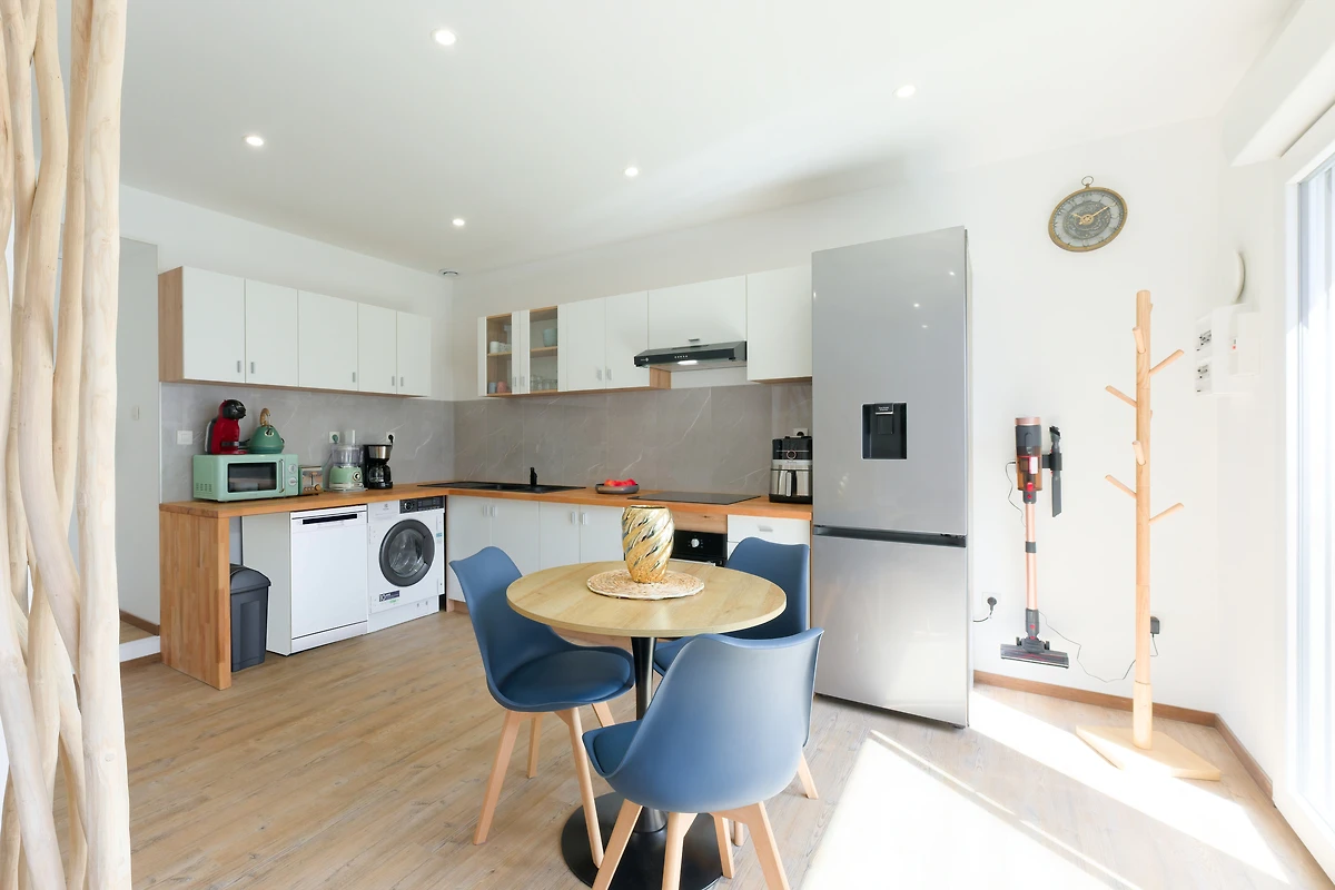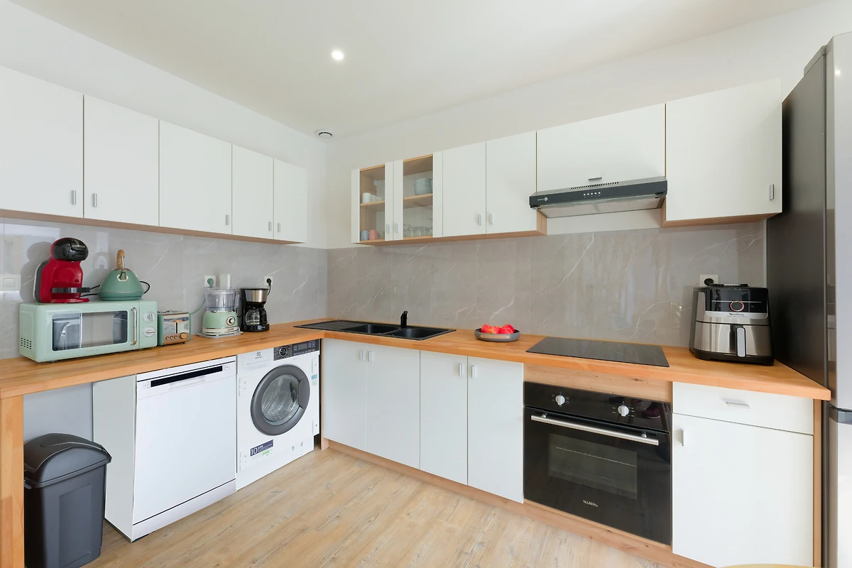 Die komplett ausgestattete Küchenzeile verfügt über eine Spülmaschine, Mikrowelle, Wasserkocher, Kaffeemaschine und alles, was Sie für die Zubereitung leckerer Mahlzeiten benötigen. Für Ihren Komfort stehen eine Waschmaschine, ein Trockner, Bügeleisen und kostenloses WLAN zur Verfügung. Ein Fernseher sorgt für Unterhaltung am Abend.