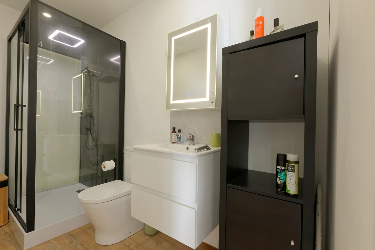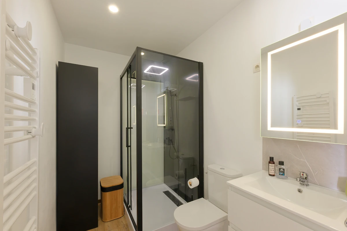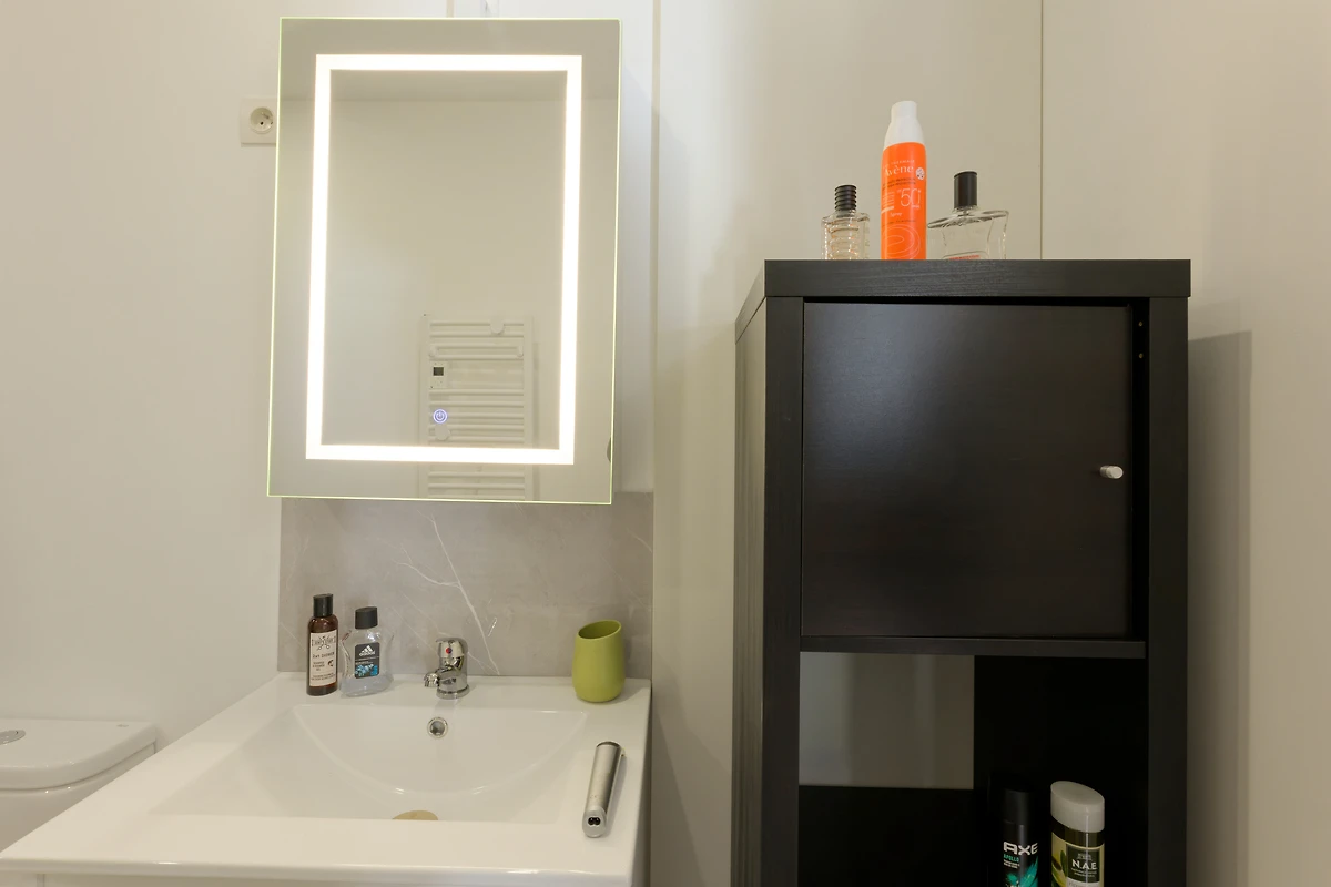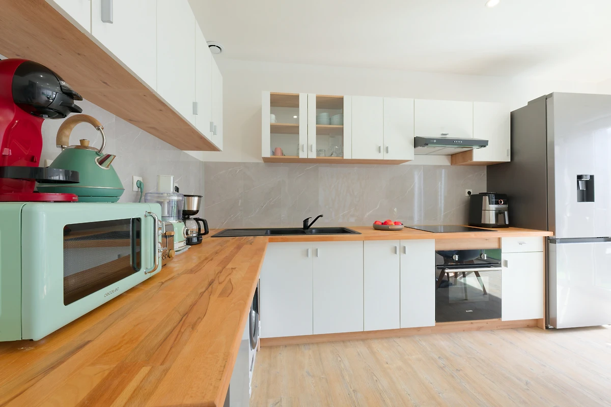 Die komplett ausgestattete Küchenzeile verfügt über eine Spülmaschine, Mikrowelle, Wasserkocher, Kaffeemaschine und alles, was Sie für die Zubereitung leckerer Mahlzeiten benötigen. Für Ihren Komfort stehen eine Waschmaschine, ein Trockner, Bügeleisen und kostenloses WLAN zur Verfügung. Ein Fernseher sorgt für Unterhaltung am Abend.