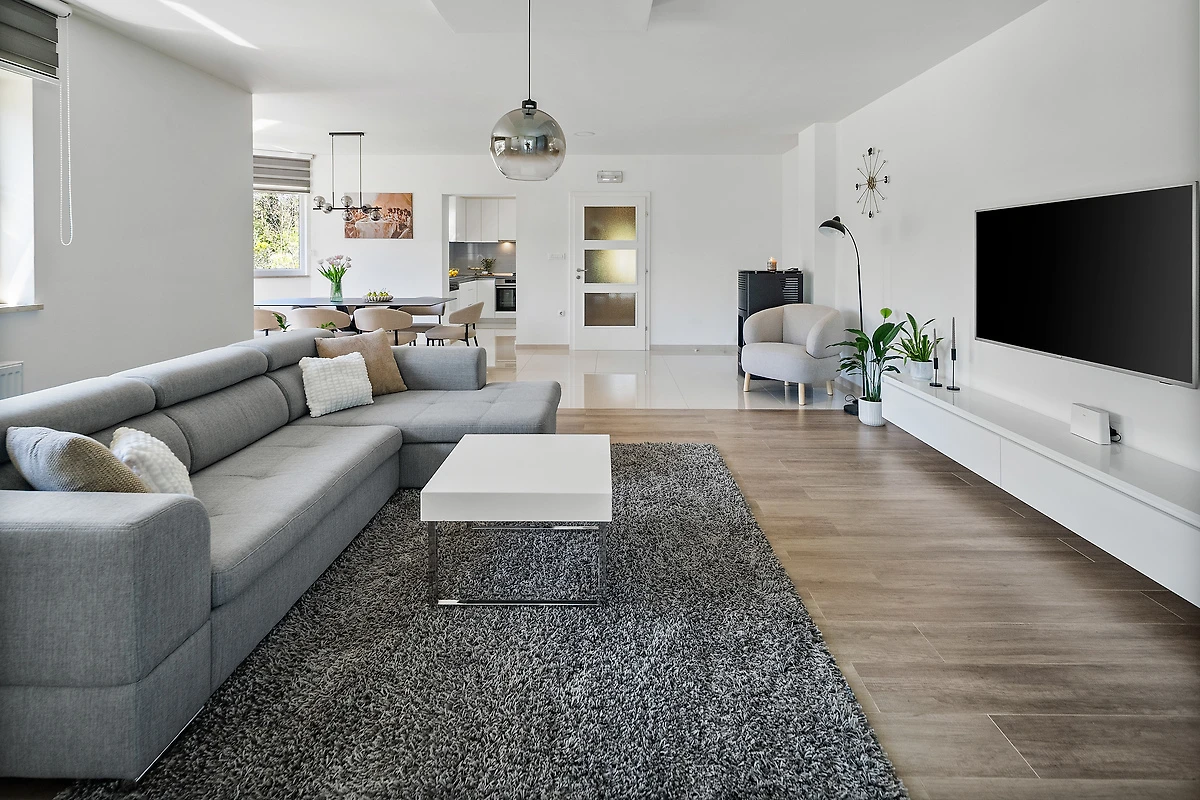 Beim Betreten der Villa erwarten Sie 250 m2 Wohnfläche, verteilt auf zwei Etagen. Das Erdgeschoss besticht durch einen großzügigen, offen gestalteten Wohnbereich, der eine voll ausgestattete Küche, einen Essbereich und eine gemütliche Lounge mit komfortablem Sofa und Flachbild-TV harmonisch vereint. Durch große Schiebetüren gelangen Sie direkt zum Poolbereich, was ein müheloses Zusammenspiel von Innen- und Außenbereich sowie entspanntes Dining ermöglicht. Ein separates Gäste-WC ergänzt diesen Bereich.