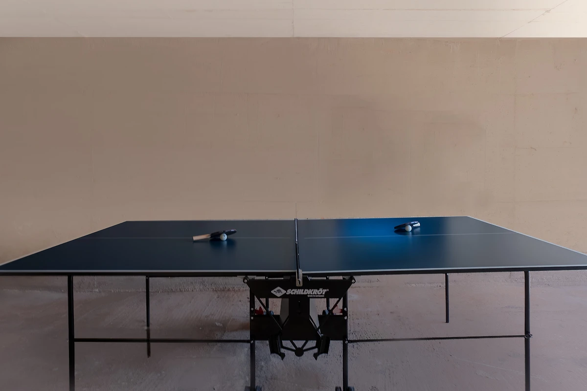 Der Außenbereich bietet außerdem eine Rasenfläche mit Schaukel und Rutsche für Kinder. Nur wenige Stufen tiefer befindet sich ein überdachter Bereich mit einer Outdoor-Tischtennisplatte – ideal für gemeinsamen Familienspaß.