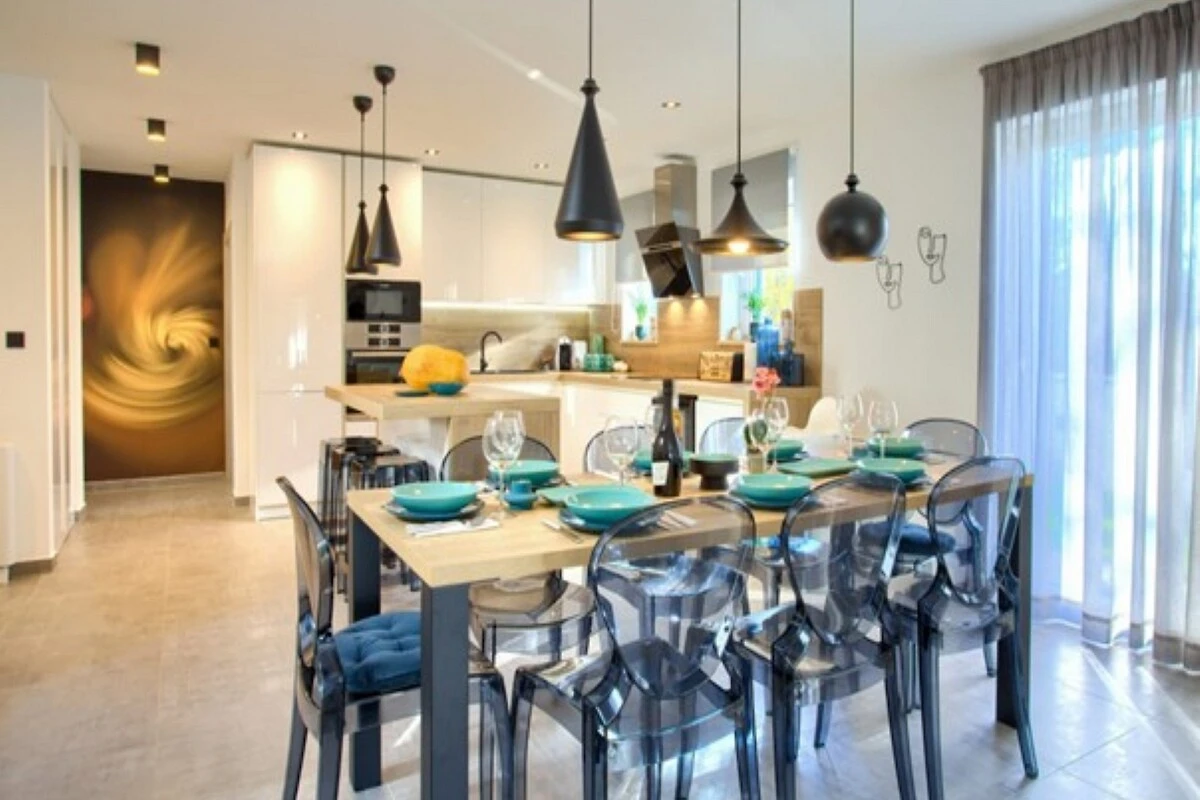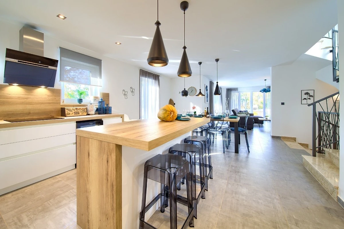 Betreten Sie die Villa, erwartet Sie ein modern und geschmackvoll eingerichtetes Erdgeschoss, das Funktionalität und Eleganz vereint. Das geräumige Wohnzimmer ist hell und luftig, ausgestattet mit bequemen Möbeln, die zum Entspannen beim Fernsehen oder geselligen Zusammensein mit den Liebsten einladen. Bei Bedarf kann das Sofa im Wohnzimmer zu einem zusätzlichen Schlafplatz für zwei Personen umfunktioniert werden. Große Glasflächen lassen viel Tageslicht herein und bieten einen schönen Blick auf den Garten und den Pool. Der Wohnbereich ist harmonisch mit einer modernen, voll ausgestatteten Küche verbunden, in der Sie alle notwendigen Geräte und Utensilien zur Zubereitung köstlicher Mahlzeiten finden. Neben der Küche befindet sich ein eleganter Essbereich, der ausreichend Platz für gemeinsame Mahlzeiten und angenehme Gespräche bietet.