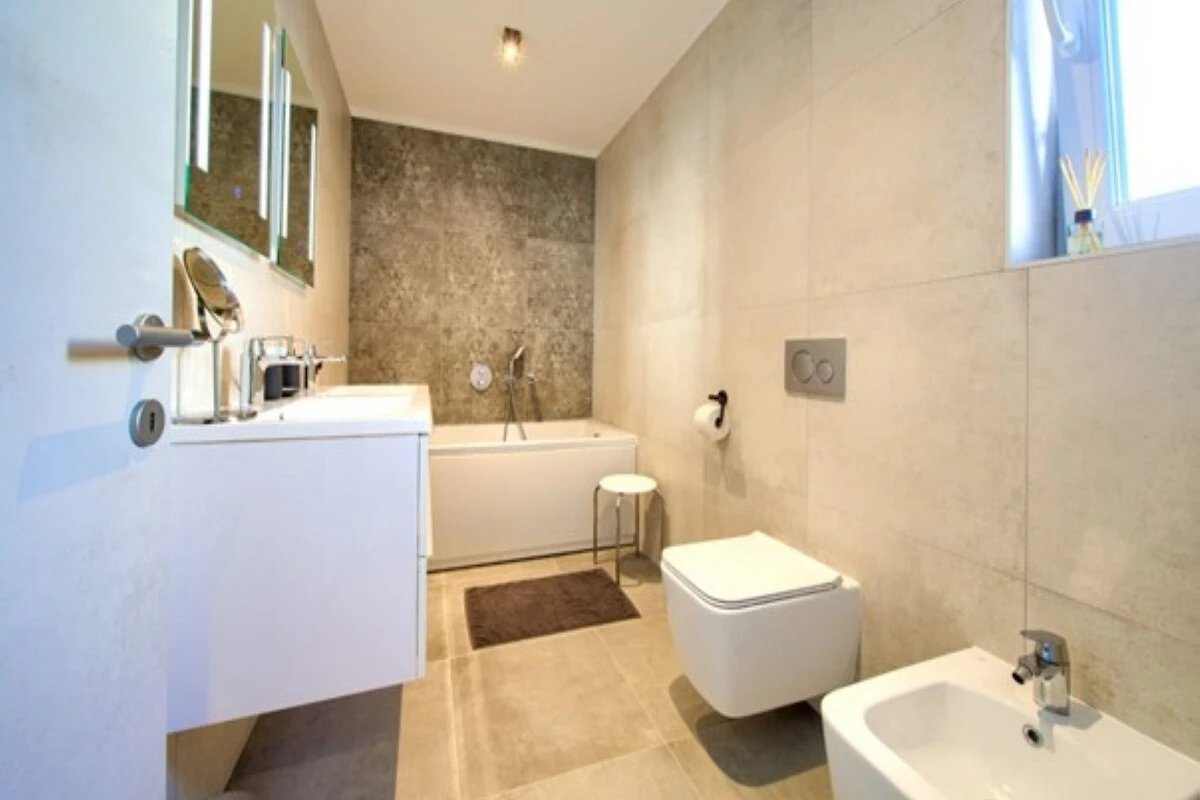 Im Erdgeschoss befindet sich auch ein komfortables Schlafzimmer mit eigenem, modernem Bad, ideal für Gäste, die mehr Privatsphäre oder einen leichteren Zugang ohne Treppen wünschen.