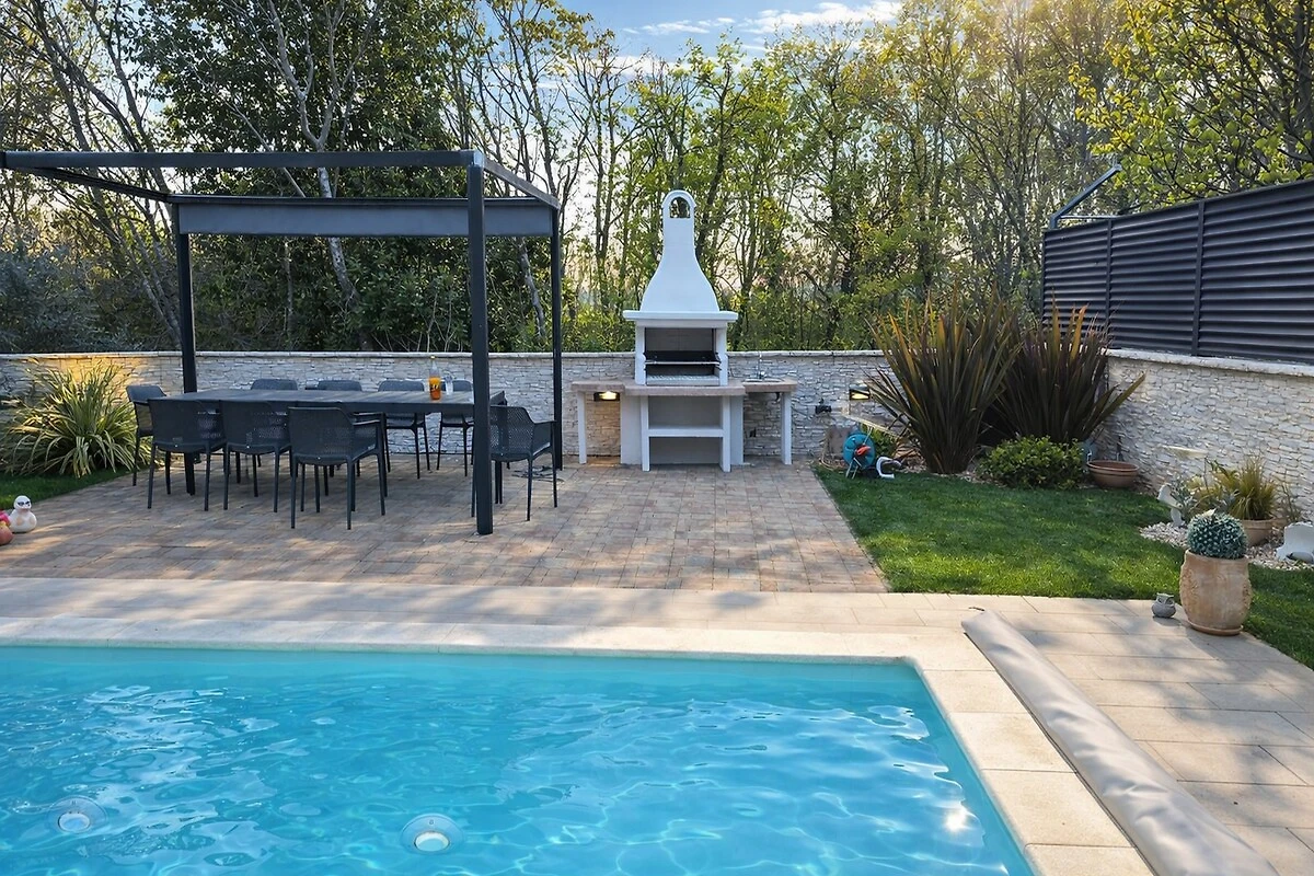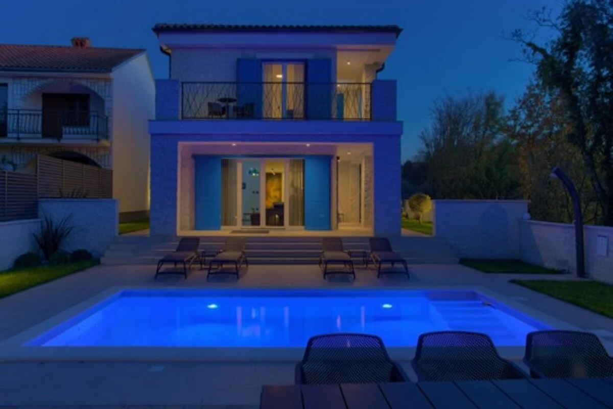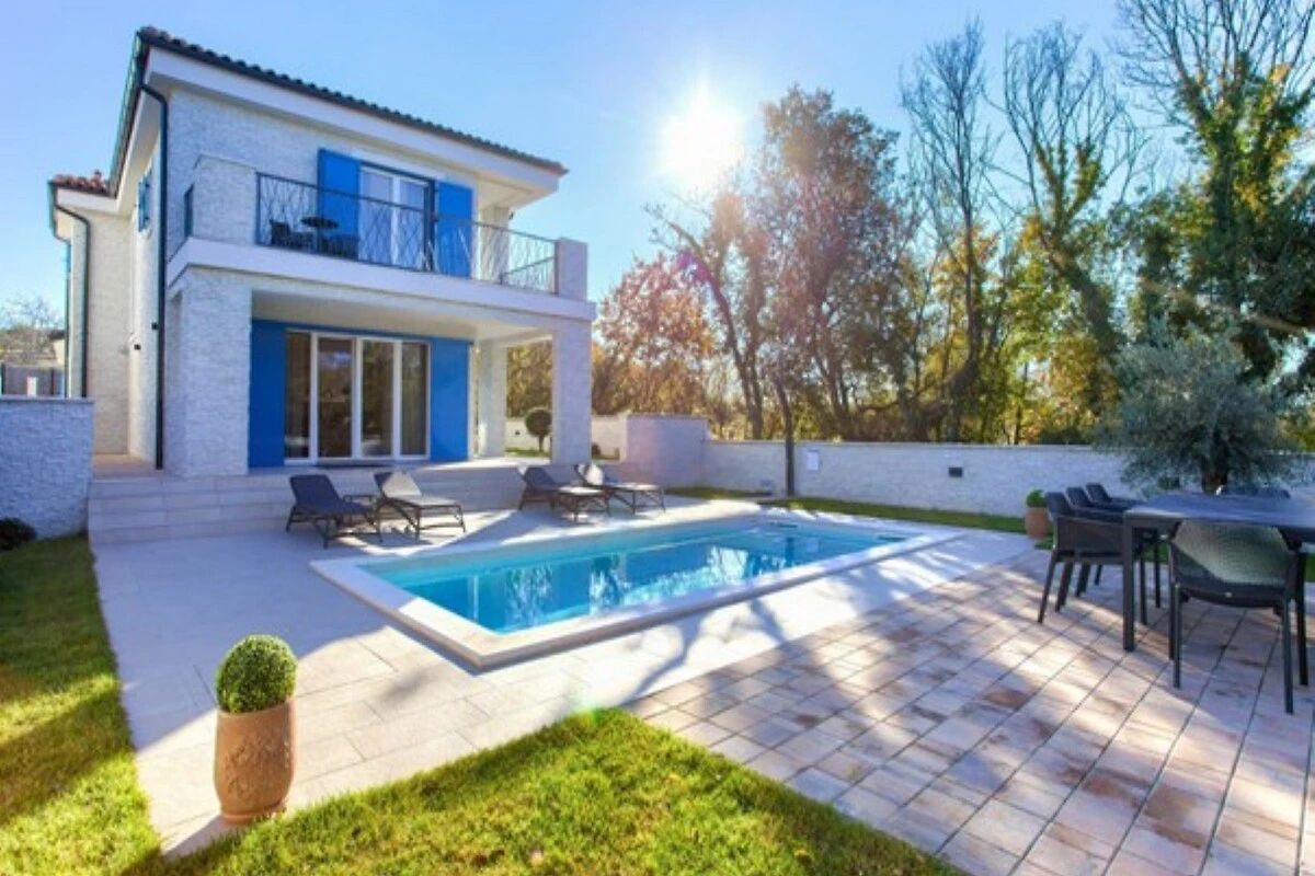 Die Außenseite der Villa wird Sie auf den ersten Blick begeistern. Die Villa befindet sich in einer ruhigen, grünen Umgebung, umgeben von einem gepflegten Garten, der völlige Privatsphäre gewährleistet, da das gesamte Anwesen sorgfältig eingezäunt ist. Die großzügige Außenterrasse bietet den idealen Raum zum Entspannen an der frischen Luft, sei es bei einem Morgenkaffee oder abendlichen Treffen. Das Herzstück der Außenseite ist ein wunderschöner, kristallklarer Pool, umgeben von bequemen Liegestühlen für unbeschwertes Sonnenbaden. Neben dem Pool gibt es auch eine überdachte Terrasse mit einem großen Esstisch und einem hochwertigen Grill, wo Sie köstliche Mahlzeiten zubereiten und warme Sommerabende in angenehmer Atmosphäre genießen können. Die Umgebung ist reich an Grün, was ein Gefühl von Ruhe, Intimität und einem perfekten Rückzugsort vom Alltag vermittelt.