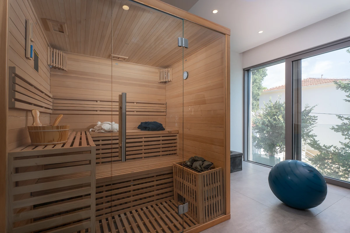 Im ersten Stock befinden sich ein finnischer Saunaraum mit Fitnessgeräten sowie vier Schlafzimme