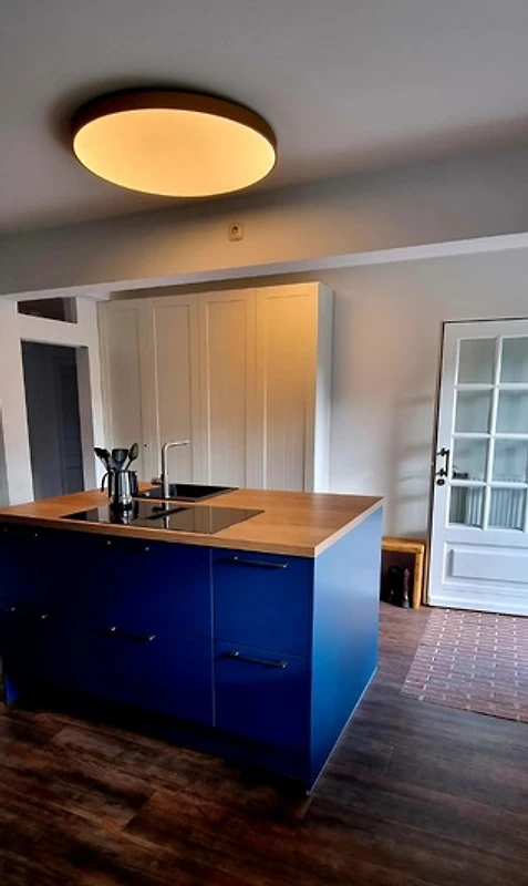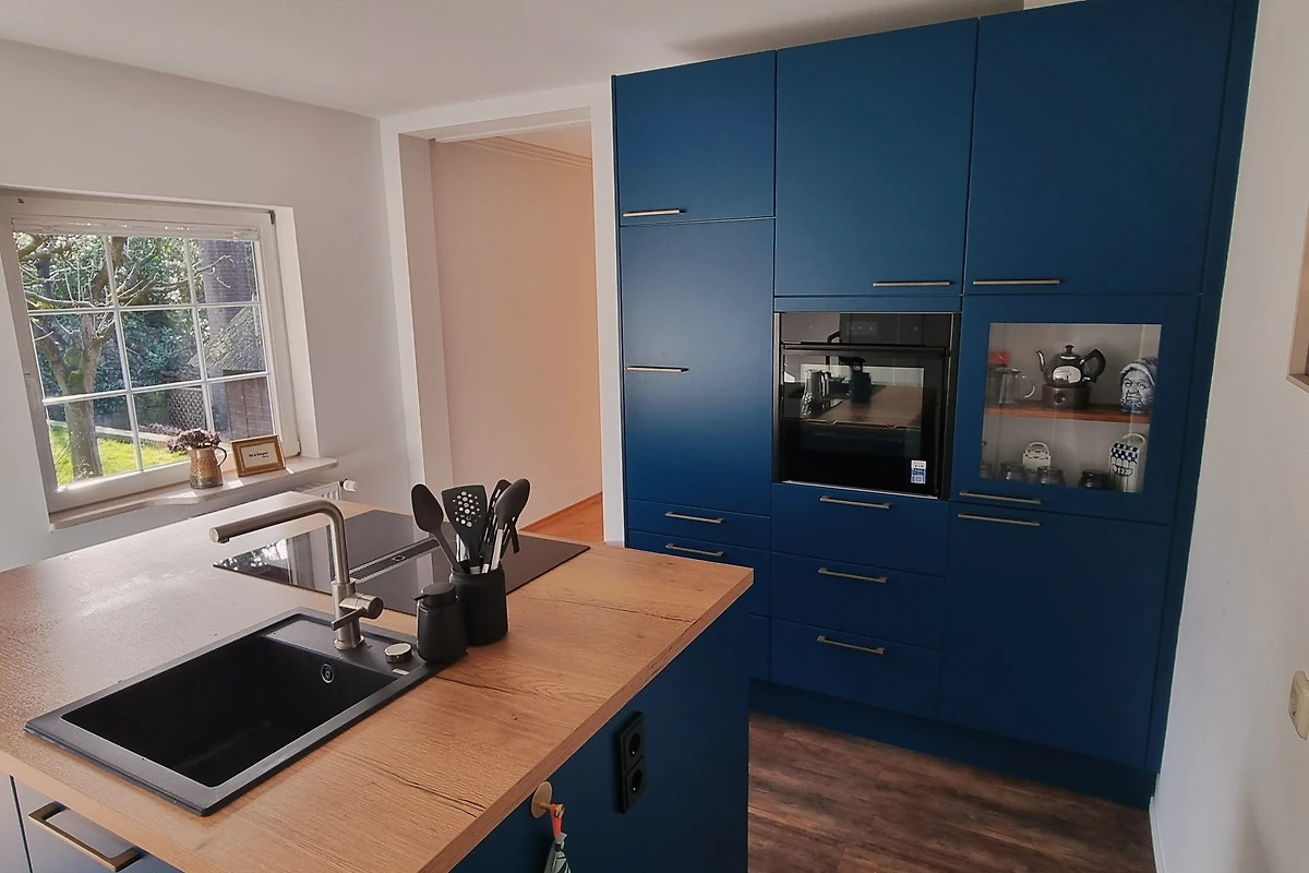 In der modernen Einbauküche befinden sich ein großes Induktionskochfeld, ein Backofen auf Sichthöhe, Kühlschrank mit Gefrierfach und eine umfangreiche Ausstattung zum Kochen und Backen.