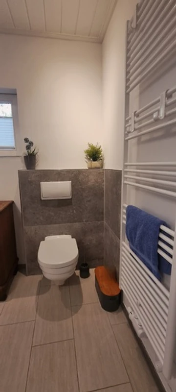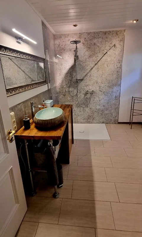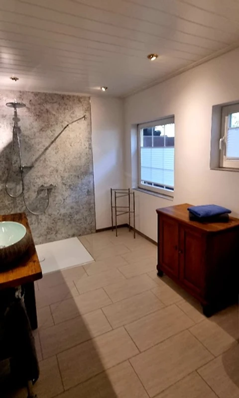 Das Badezimmer ist mit großer, begehbarer Dusche/Regendusche ausgestattet. Ein zweites, separates WC ist vorhanden.
