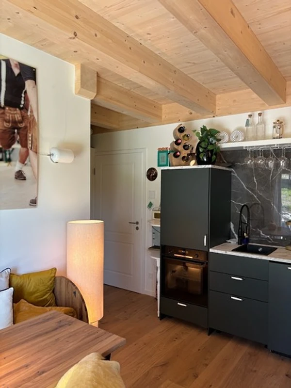Auf 32 m² erwarten dich Eichenparkett mit Fussbodenheizung, ein gemütlicher Wohn‑Essbereich mit kompletter Küche und Elektrokamin, ein separates Schlafzimmer sowie eine grosse Terrasse mit Blick ins Grüne.