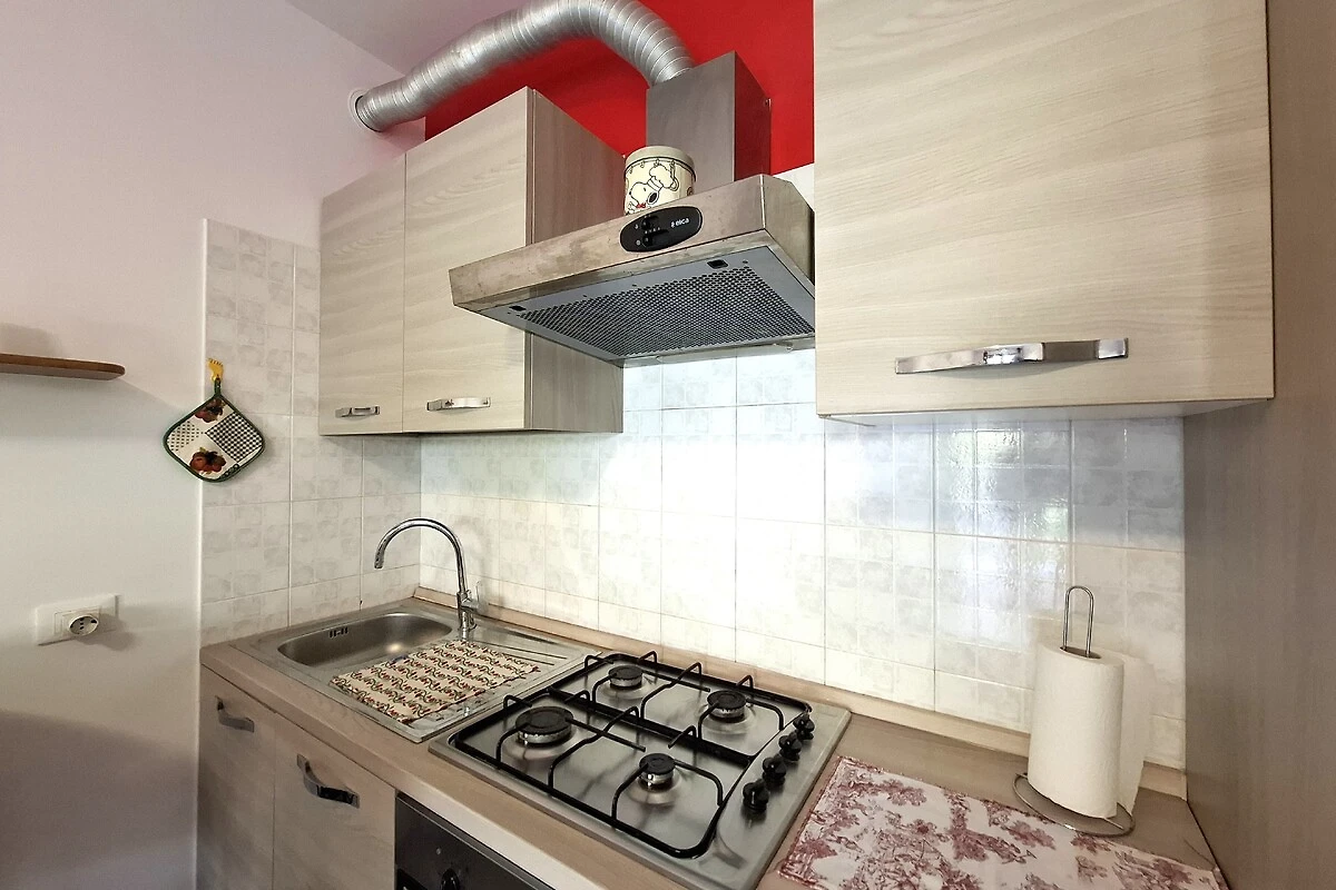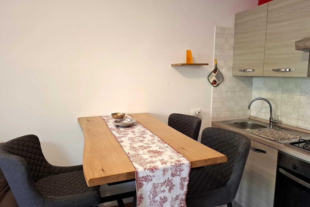 Im Inneren erwartet Sie eine voll ausgestattete Küchenzeile mit Wasserkocher, Kaffeemaschine und allen nötigen Utensilien, um gemeinsam zu kochen und zu genießen. Die Wohnung ist klimatisiert, sodass Sie auch an warmen Tagen stets für angenehme Temperaturen sorgen können. Für Unterhaltung sorgt ein TV und dank kostenlosem WLAN bleiben Sie auch im Urlaub bestens vernetzt.