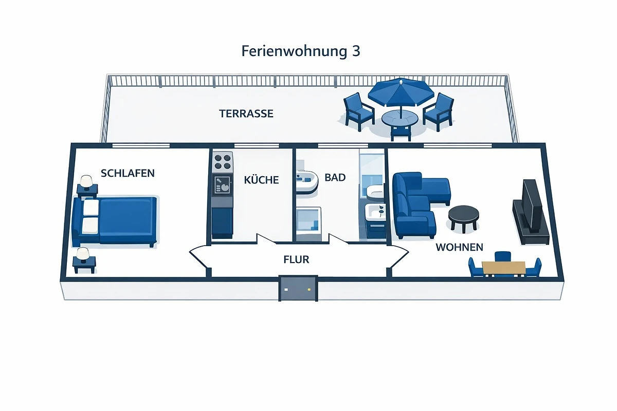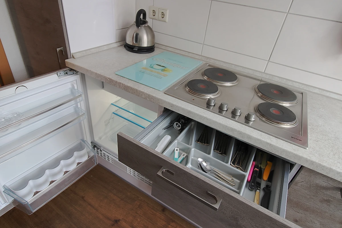 Die Wohnung ist für zwei Personen ausgelegt und bietet alles, was Sie für einen erholsamen Aufenthalt benötigen: ein gemütliches Wohnzimmer mit Eckcouch und Flat‑TV, eine vollständig ausgestattete Küche mit Herd, Kühlschrank, Mikrowelle, Kaffeemaschine, Wasserkocher und Toaster sowie ein modernes Bad mit Dusche, WC, Föhn und eigener Waschmaschine. Im Schlafzimmer erwartet Sie ein komfortables Doppelbett (180×200 cm) und ausreichend Stauraum. Alle Räume verfügen über Verdunklungsmöglichkeiten für einen ruhigen Schlaf. Bettwäsche, Handtücher und WLAN sind selbstverständlich inklusive.
