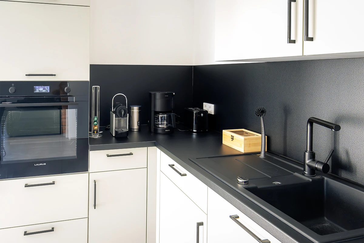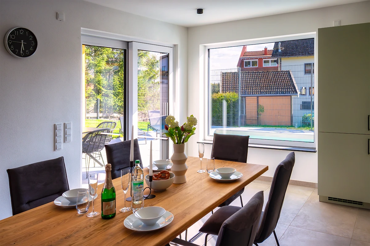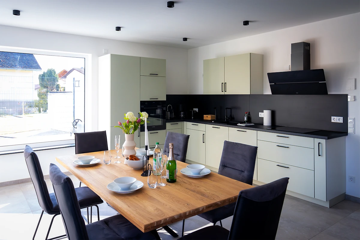 Die stilvoll eingerichteten Bungalows überzeugen durch eine hochwertige, voll ausgestattete Küche mit modernen Geräten wie Induktionskochfeld, Backofen sowie Kühl-Gefrierkombination. Der elegante Essbereich mit edlem Eichentisch lädt zum gemeinsamen Genießen und Verweilen ein.