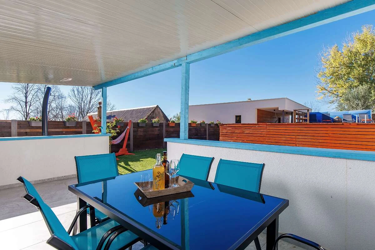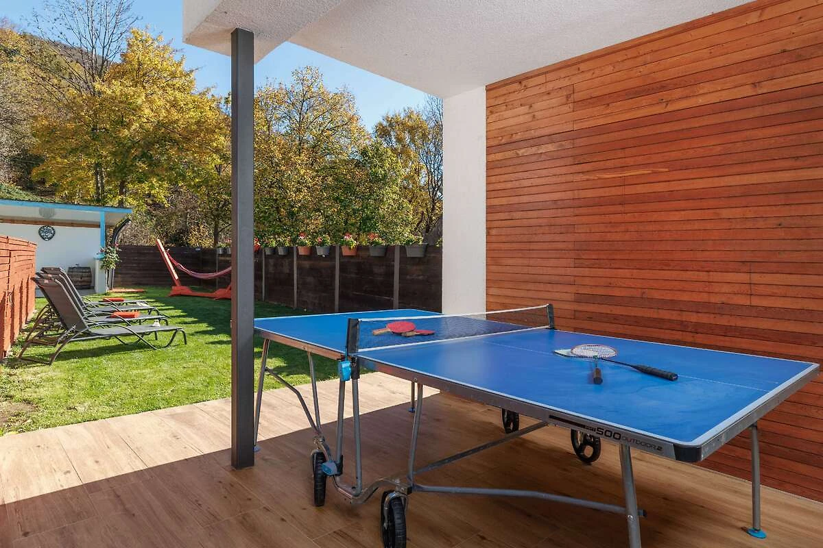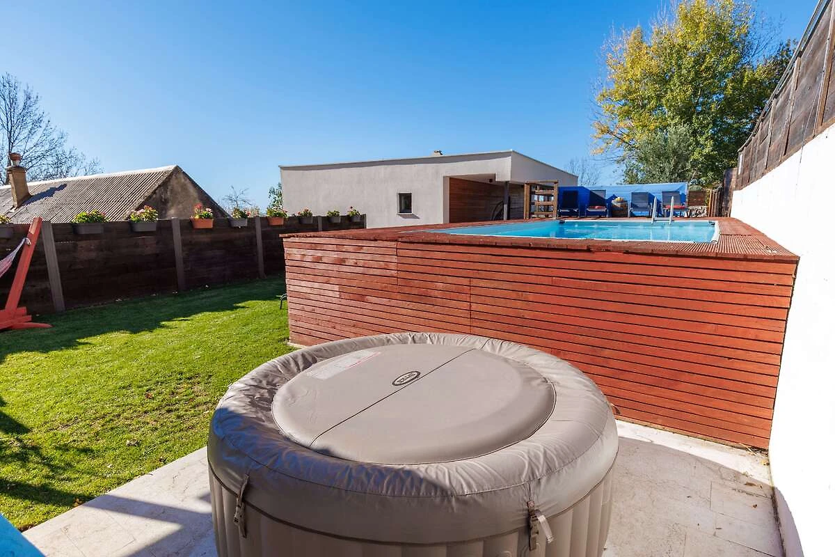 Draußen lädt der 7,5 x 3,5 m große Pool mit bequemen 8 Sonnenliegen zum Entspannen ein. Das Highlight: Ihr privater Jacuzzi – perfekt für laue Abende mit Blick auf den Sternenhimmel. Das 450 m² große Grundstück bietet zudem Platz für gemeinsame Mahlzeiten im Freien und Freizeitspaß mit Tischtennis.