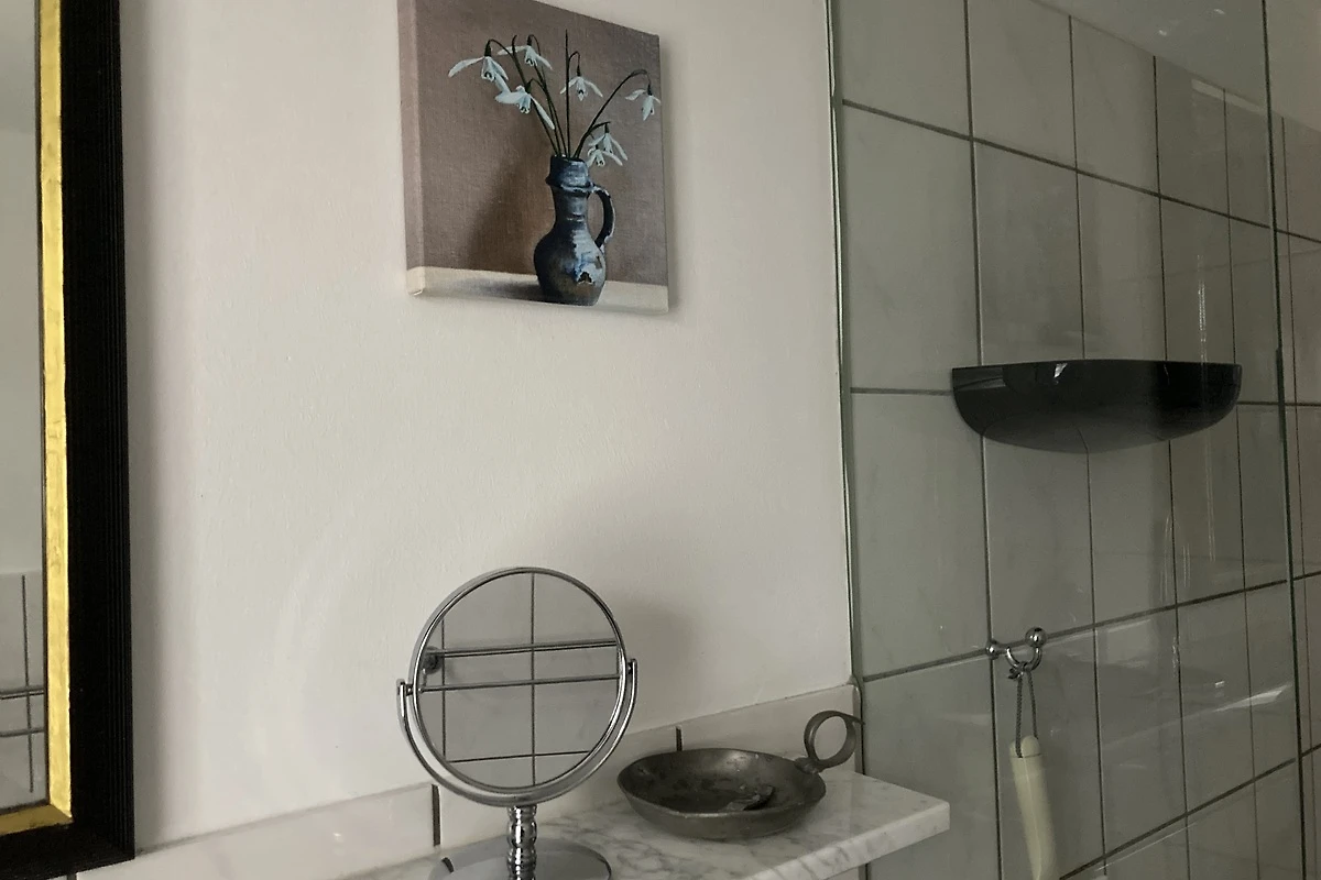 Der Wohn- und Essraum, die gut ausgerüstete Küche, ein Schlafraum mit Doppelbett, schönem alten Kleiderschrank und Kommode sowie das Bad mit bodengleicher Dusche liegen ebenerdig. Über eine Treppe kommen Sie in den hellen, Licht durchfluteten zweiten Wohnbereich