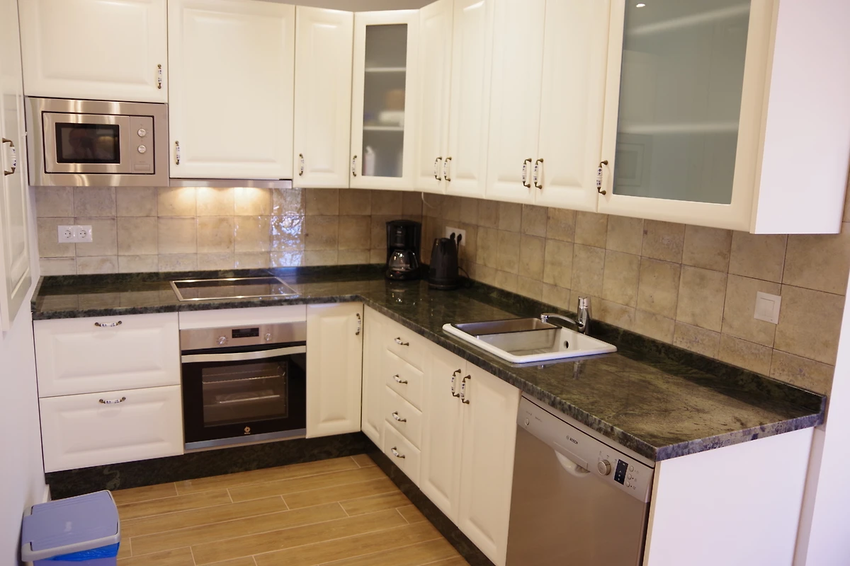 Das Wohnzimmer mit zwei gemütlichen Sofas über Eck ist technisch gut ausgestattet mit SAT TV (deutsche Sender), Netflix/Prime Video, Musikanlage m. CD Player. Internetanschluss über WLAN. Deckenventilator. Die offene Küche ist komplett eingerichtet mit grossem Kühlschrank mit separatem Gefrierfach, Ceran-Kochfeld, Backofen, Geschirrspüler, Kaffeemaschine, Toaster, Mikrowelle