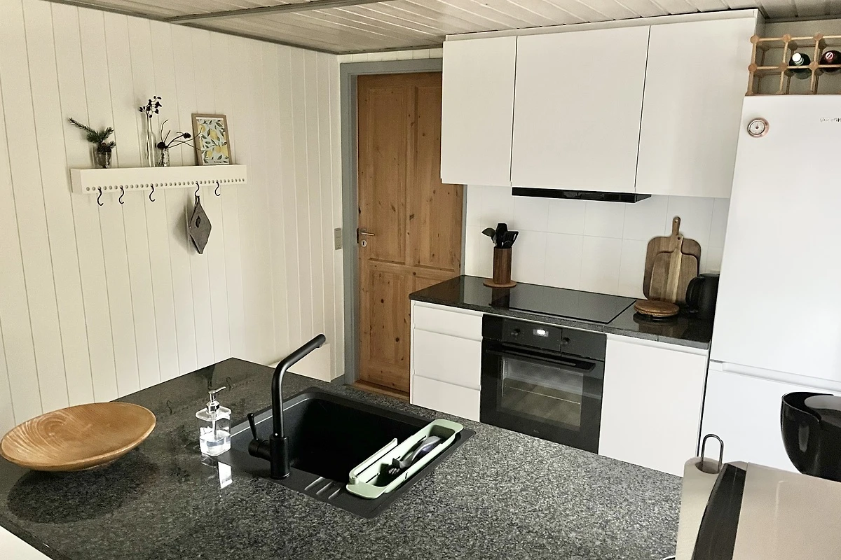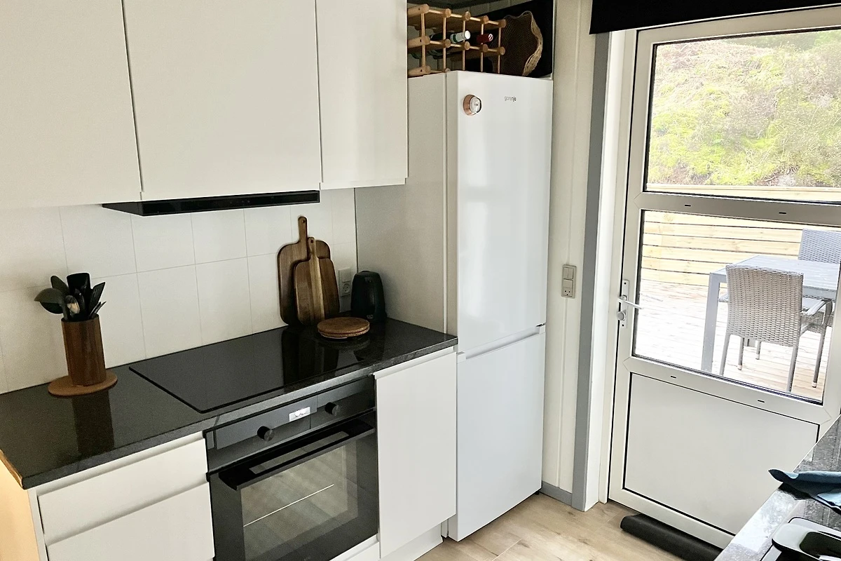 Die helle moderne eingerichtete Küche ist mit dem Wohnzimmer kombiniert, und ist mit Kühl und Gefrierschrank, Mikrowelle und Geschirrspüler ausgestattet.