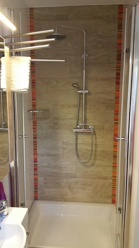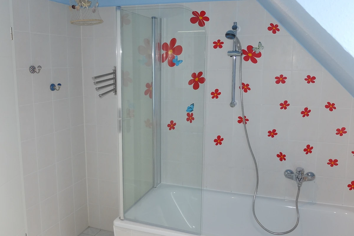 2 Bäder: Wannenbad mit Toilette, Waschmaschine und Fön sowie separates Duschbad/WC