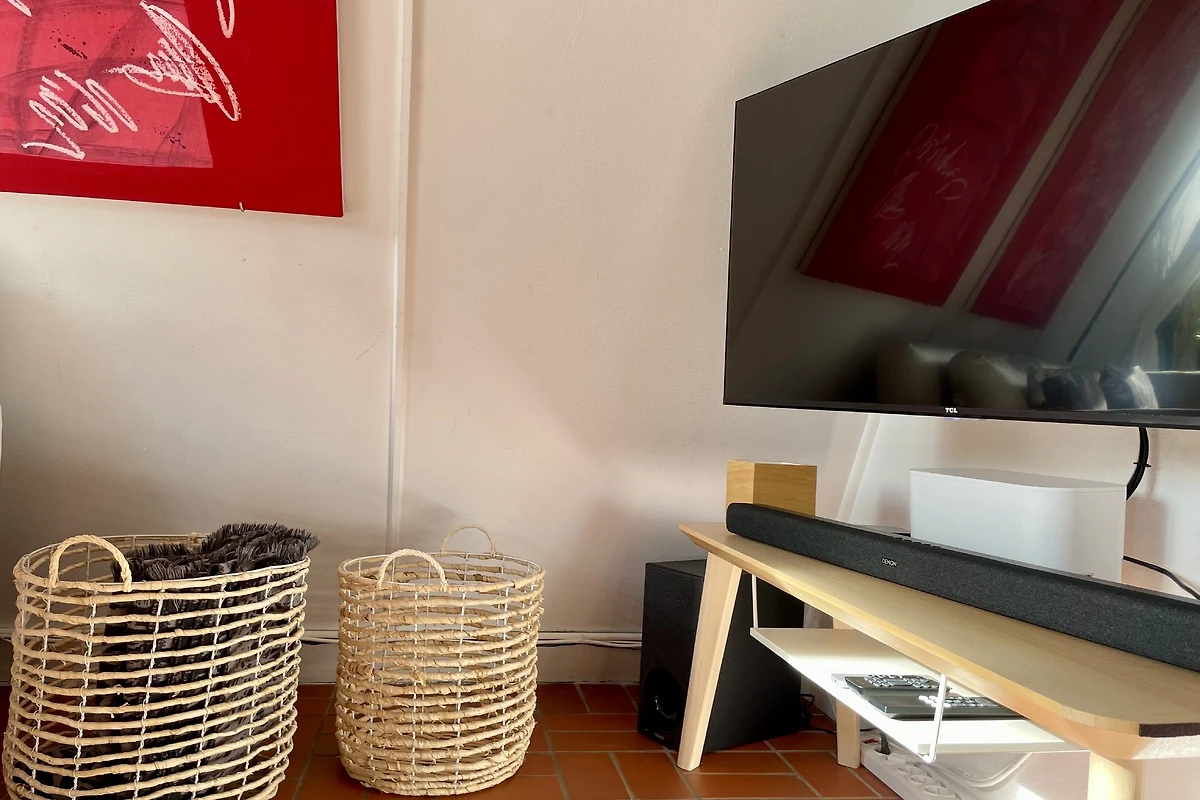 QLED Smart Tv mit ´Chromecast´ und ´Apple Air Play´ und einer DENON Soundbar mit Bluetooth. So können Sie Filme und Musik streamen und sich ganz einfach in ihren eigenen Netflix, Disney+, Apple Tv und Spotify… accounts anmelden :-)