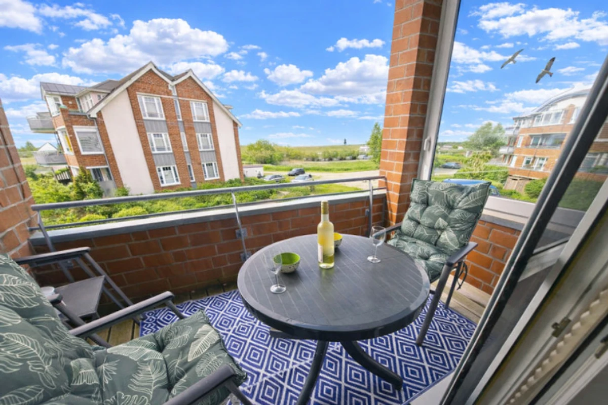 Vom Balkon aus (Balkonbestuhlung vorhanden )blicken Sie auf den Nordseedeich und die Nordseemarsch. Der Balkon ist eingezogen, ein Nachbar hat keinen Einblick. Das Badezimmer ist modern eingerichtet.