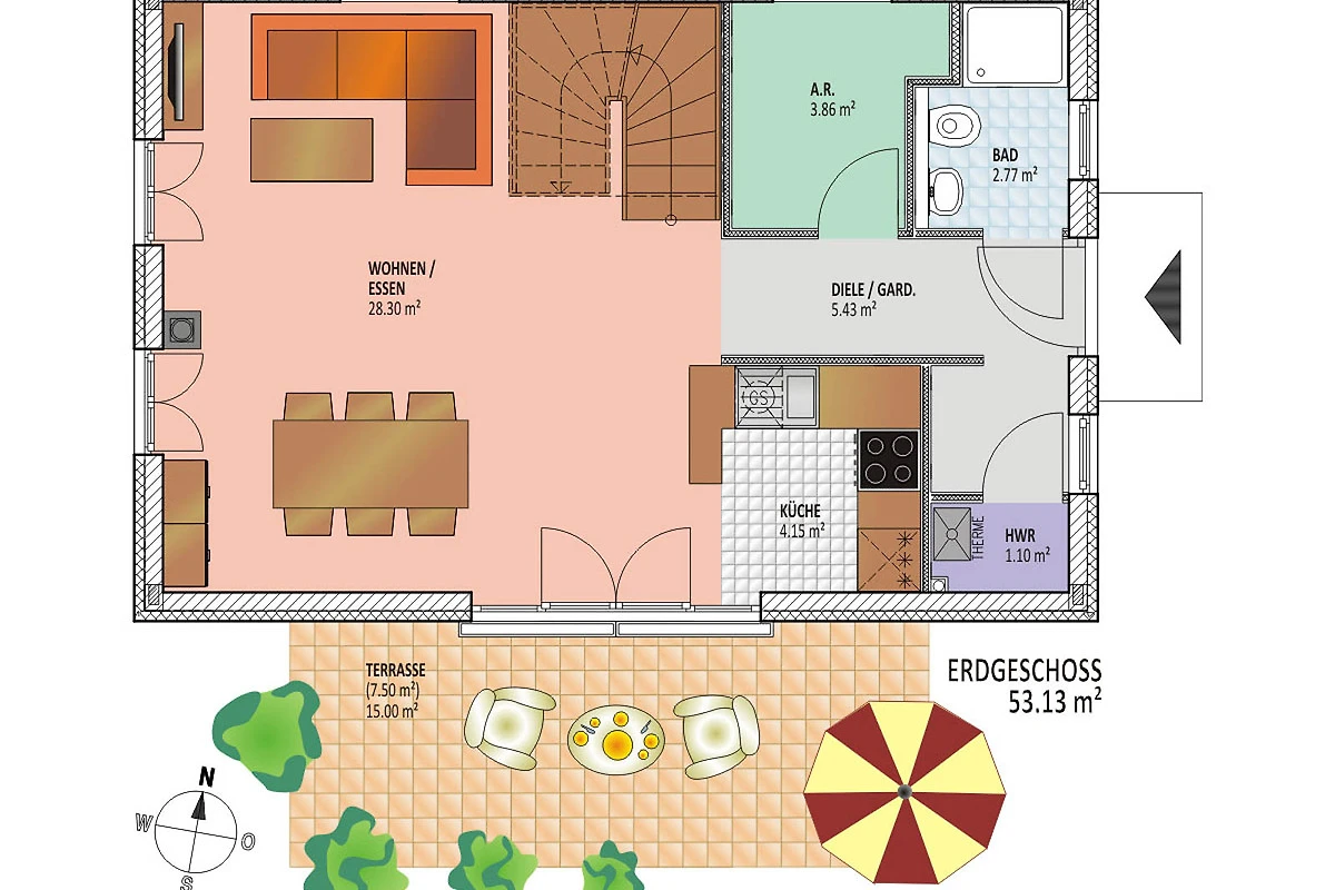 Zwei PKW-Stellplätze befinden sich direkt auf dem Grundstü Garten befindet sich ein Blockbohlenhaus, in dem Sie Fahrräder oder andere Freizeitgeräte gerne unterstellen können. Zur Ausstattung des Gartens gehören neben Gartentisch/-stühlen auch ein Grill, ein Strandkorb und 2 Liegen.
