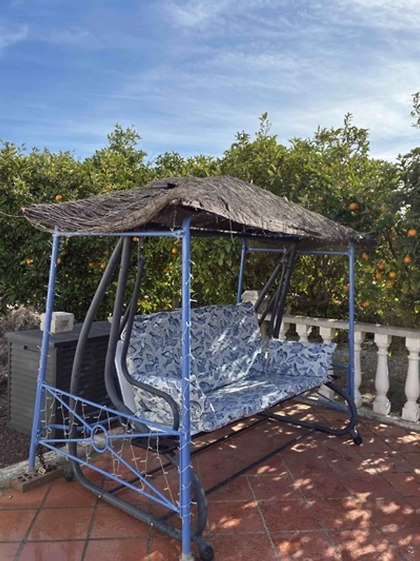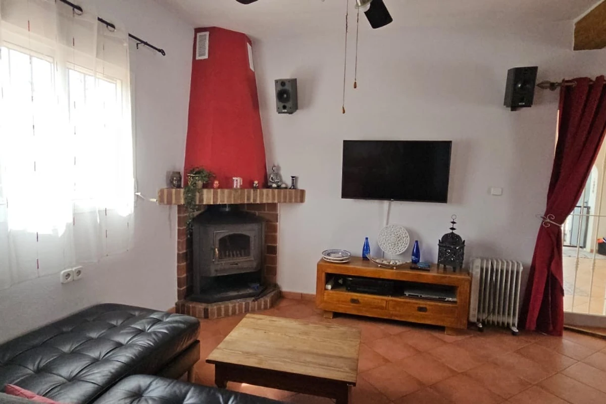 Die große überdachte Terrasse im typischen spanischen Stil bietet einen traumhaften Ausblick auf den Poolbereich und die Obstbäume. Ein Grillkamin der im Sommer als offene Küche verwendet wird, garantiert gemütliche Stunden unter der spanischen Sonne. Wenn es einmal gegen Abend etwas kühler wird steht ein Gasheizpilz zur Verfügung (auf Anfrage).