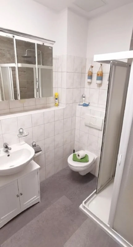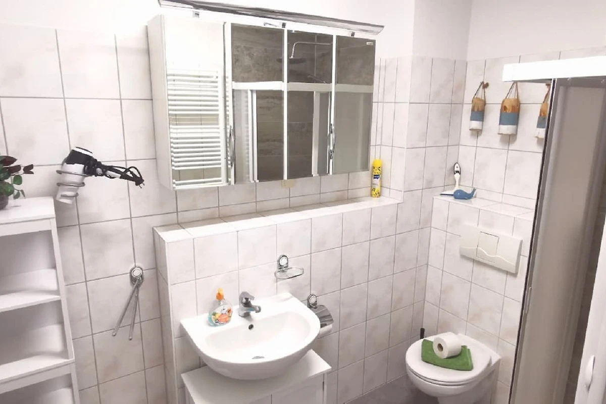 • 1 Badezimmer mit WC, Waschbecken und ebenerdiger Dusche