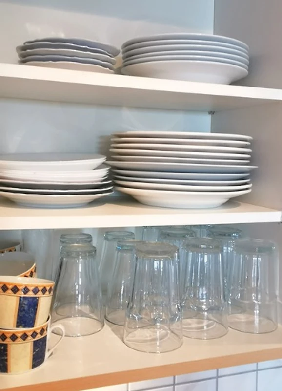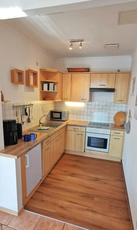 • 1 komplett eingerichtete Küche mit Geschirrspüler, Mikrowelle, Herd mit Ofen, Kaffeemaschine, Toaster, Kühlschrank