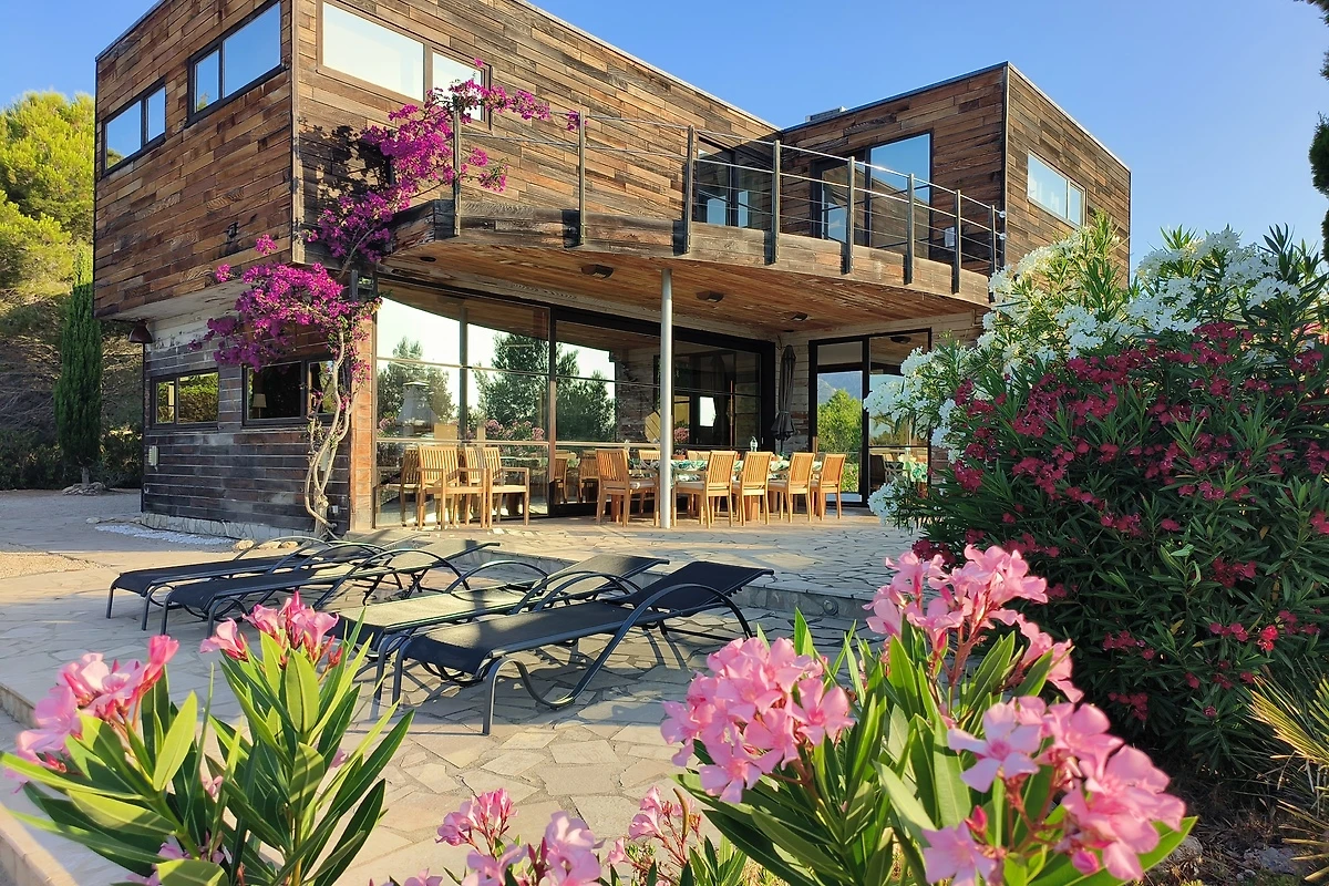 Die Küche ist mit dem Esszimmer mit der schönen Kücheninsel verbunden. Das Schiebefenster ermöglicht den Zugang zu den XXXL-Terrassen. Die weitläufige Terrasse aus spanischem Naturstein verführt zum Wohnen im Freien. Die Terrasse ist mit einem Tisch aus Teakholz und 12 Stühlen mit Armlehnen ausgestattet. Der große Grill lädt zum mediterranen Kochen ein!