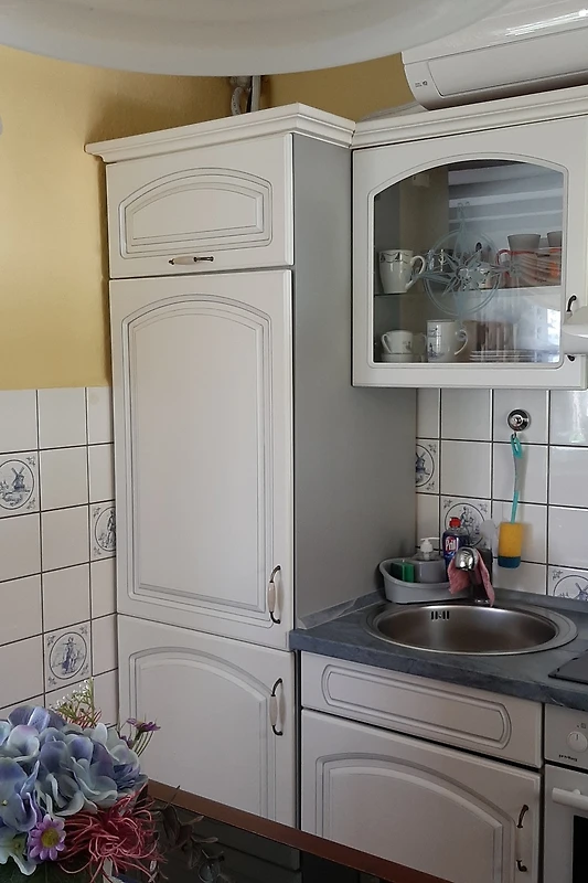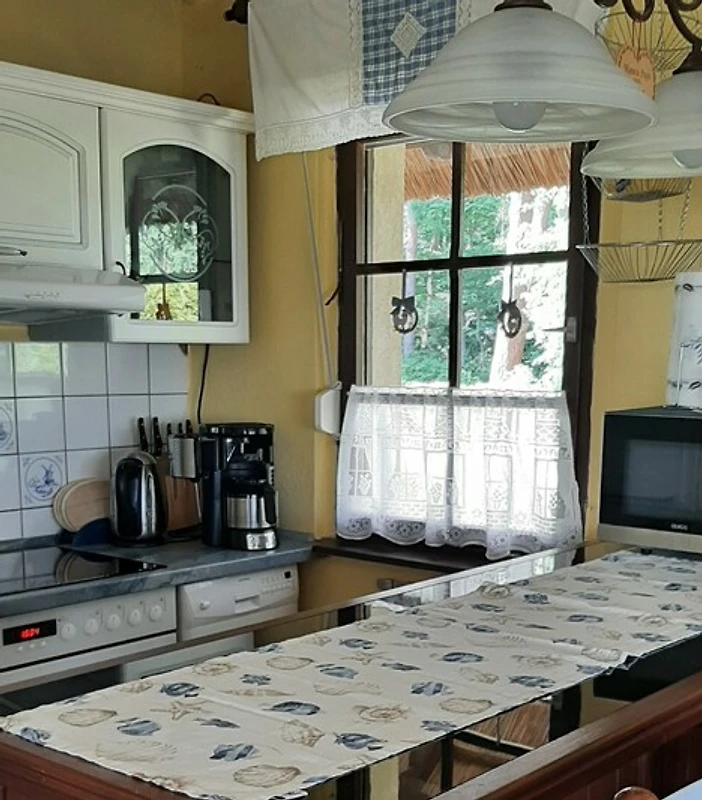 Die Küche ist mit Geschirrspüler, Herd mit Ceranfeld, Backofen, Kühlgefrierkombi , Kaffeemaschine, Wasser -u. Eierkocher und Toaster ausgestattet. Im Wohnbereich befindet sich ein bequemes Ecksofa zum Ausziehen und ein LCD-HD-TV.