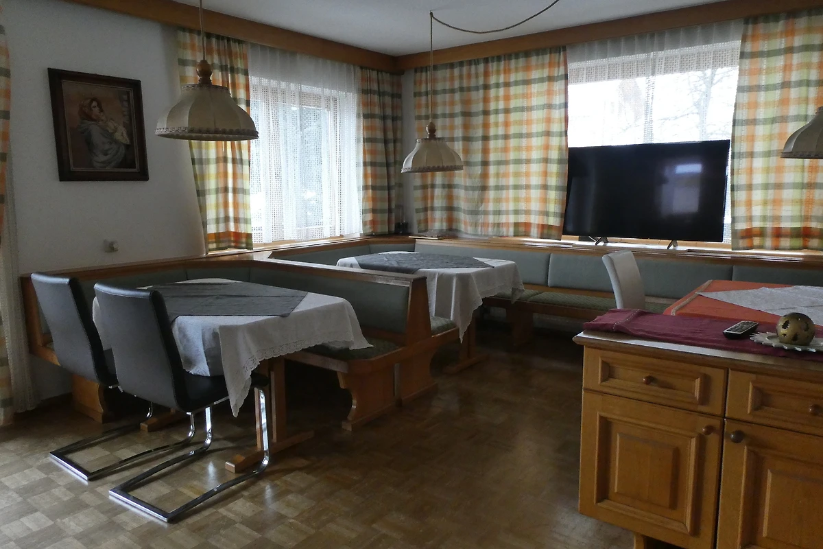 Das Wohnzimmer ist ca. 35m² groß und hat 3 große Tische zum Sitzen mit Sat-TV und Kaminofen mit Zugang zu einer sonnigen Terrasse. Holz für den Kaminofen ist vorhanden.