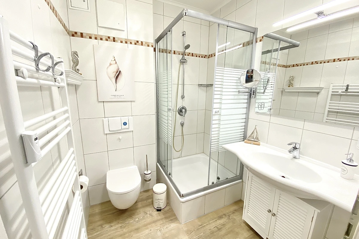 Im Appartement finden Sie ein Bad mit Dusche und WC, Haartrockner und Kosmetikspiegel,