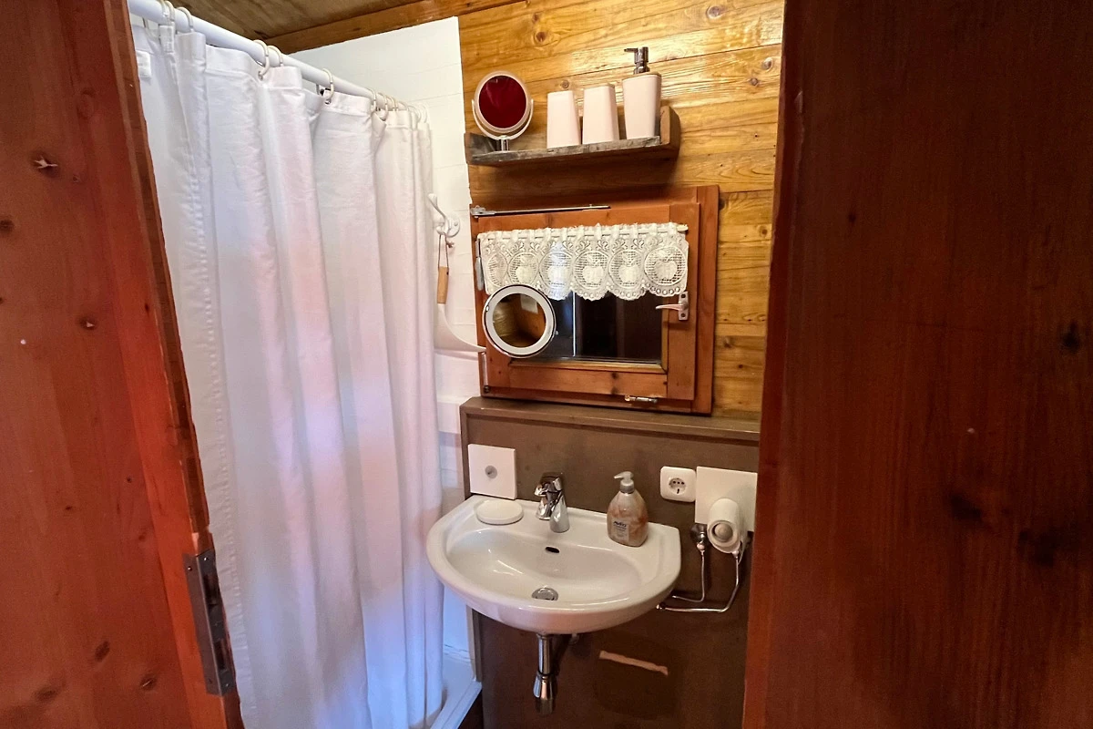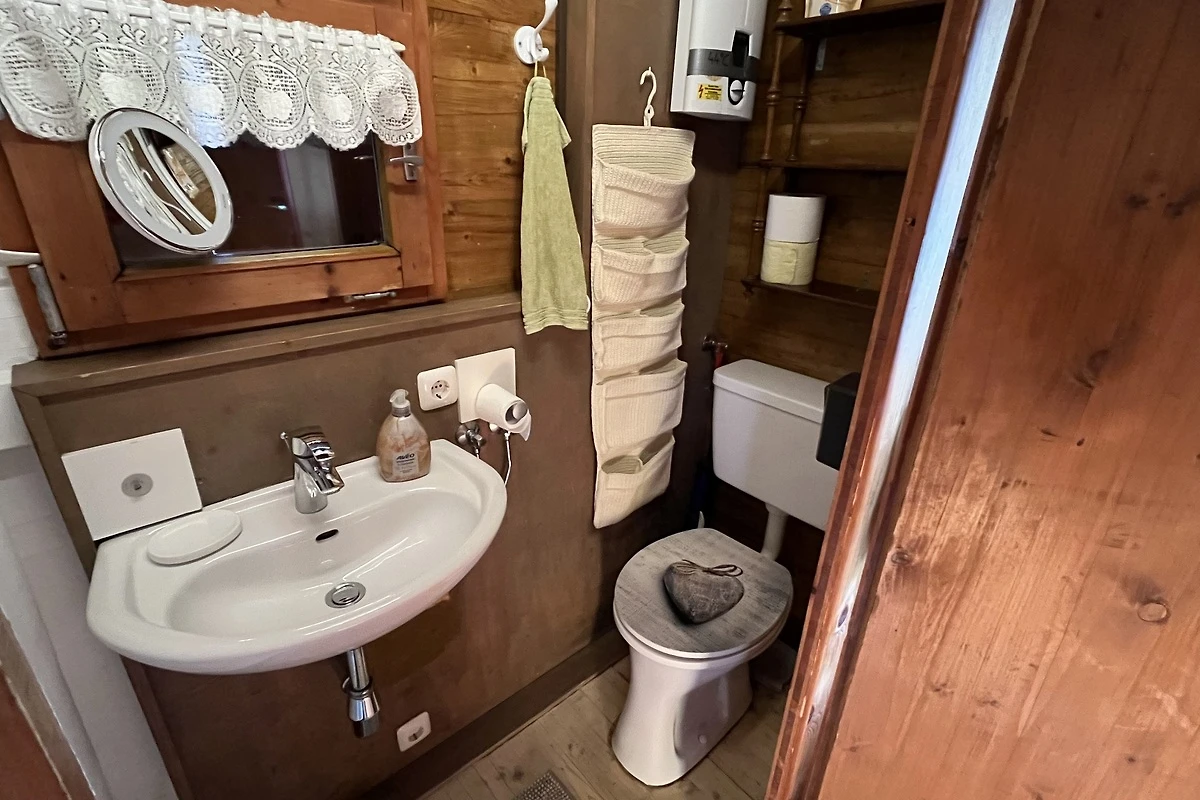 Da die Hütte recht naturbelassen und dadurch sehr gemütlich und charmant ist, verfügt sie nur über ein sehr kleines Duschbad mit WC, Waschbecken und Dusche. Selbstverständlich gibt es eine Heizung und warmes Wasser.