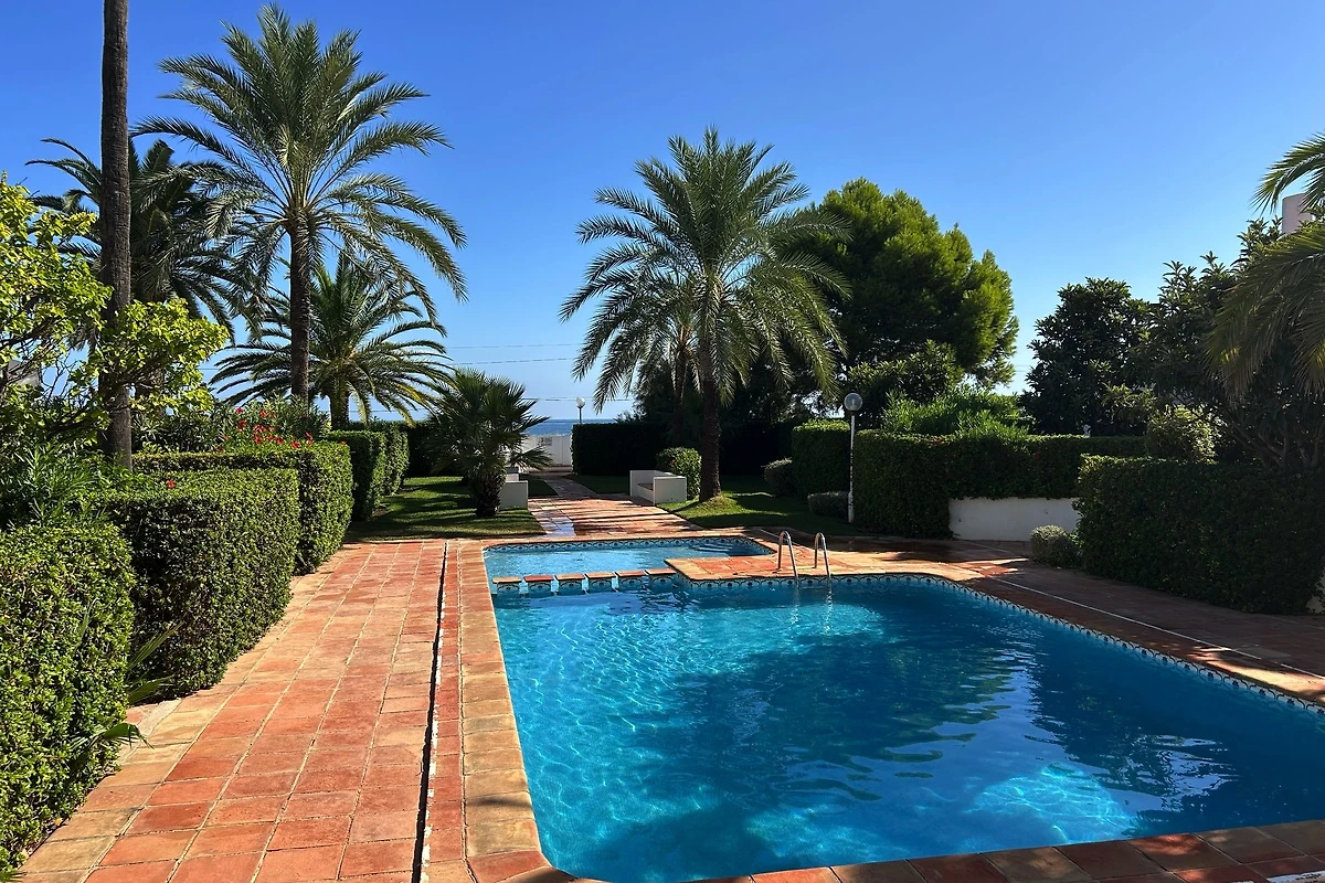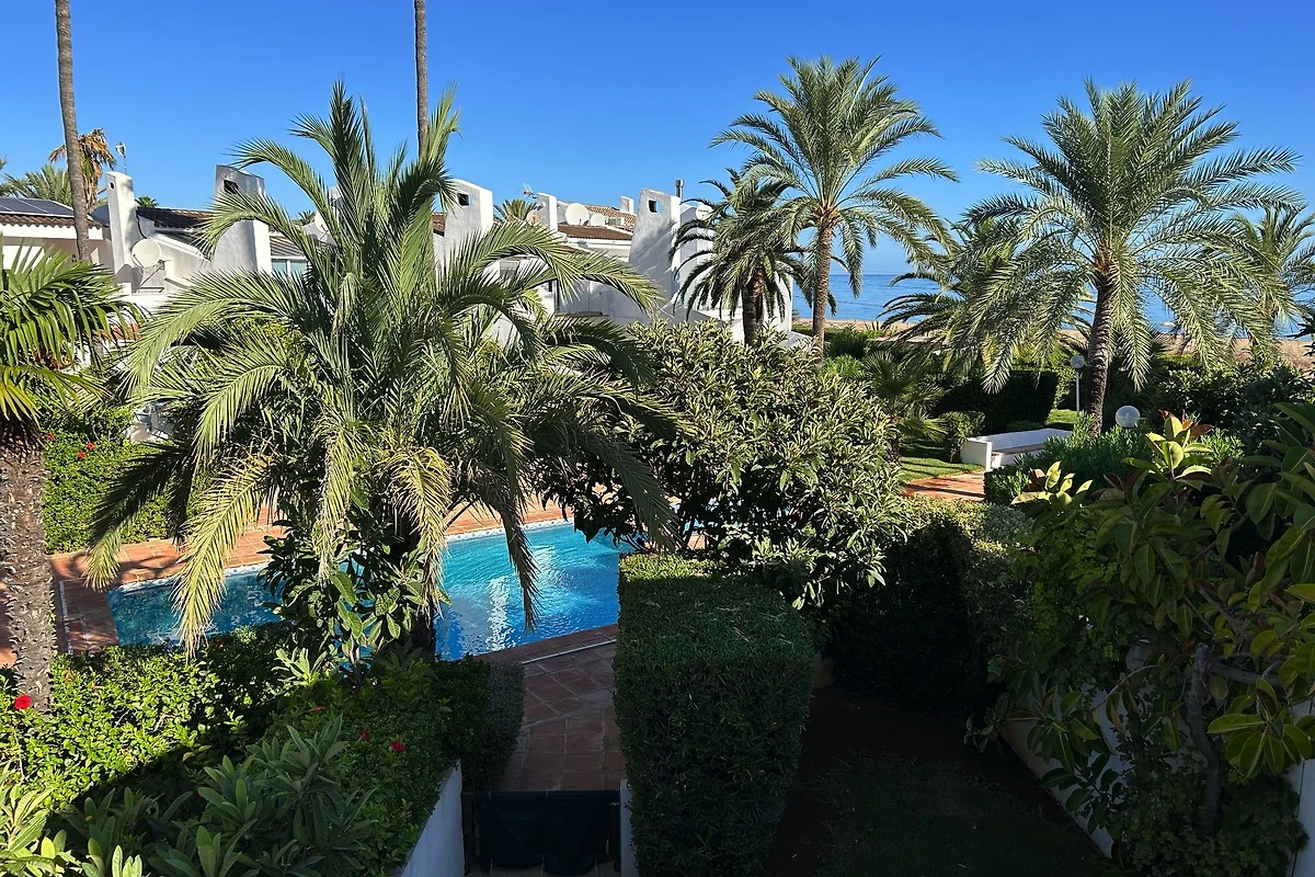 Das moderne, komfortable Reihenhaus befindet sich in einer kleinen, ruhigen Anlage ( 2 Reihen á 9 Häuser) mit herrlichem Palmengarten, Gemeinschaftspool mit abgeteiltem Kinderschwimmbecken, direkt am kilometerlangen Sandstrand Las Marinas in Stadtnähe (ca. 10 min Fussweg zum Zentrum Denia). Vom Strand trennt Sie nur ein Gartentor.