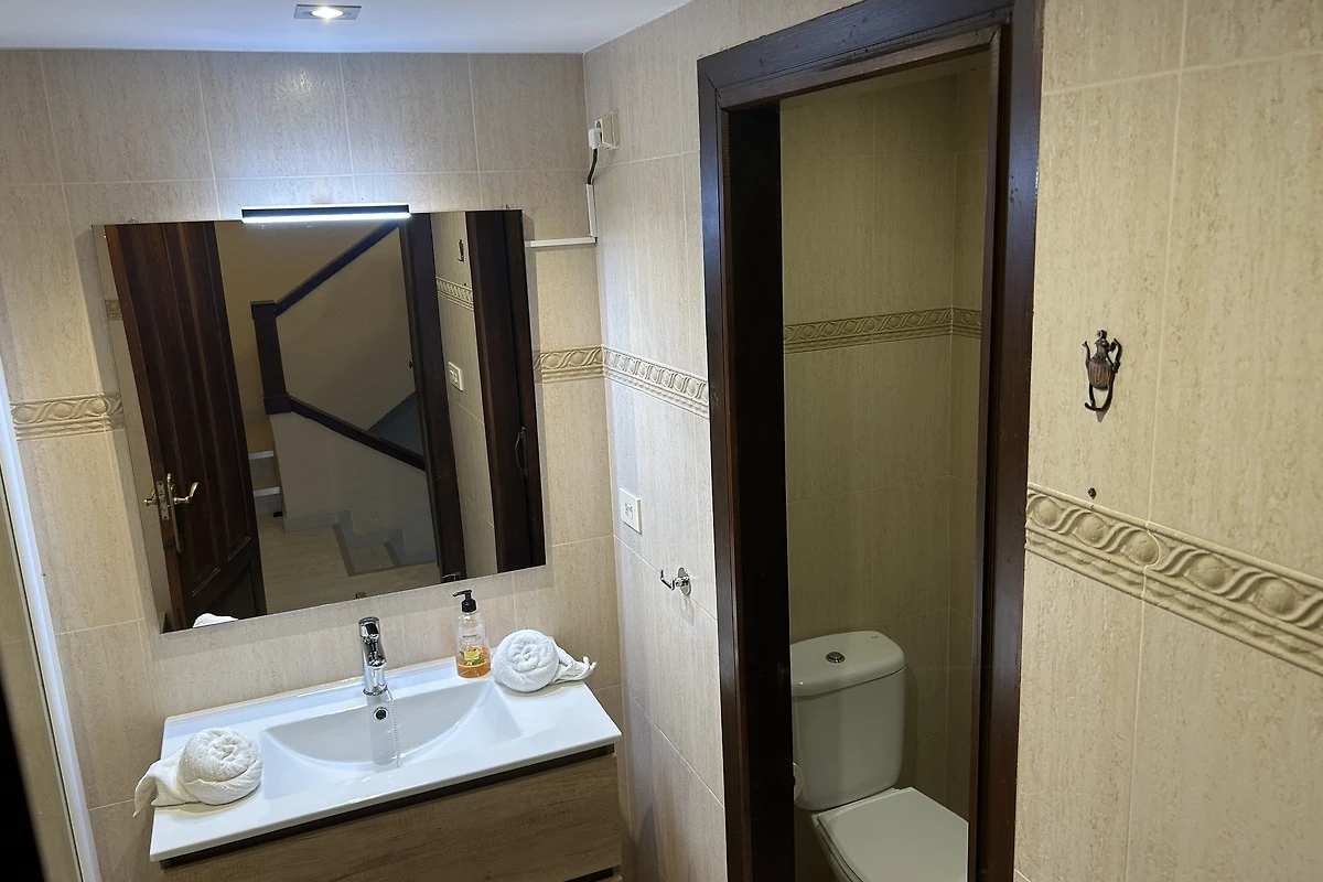 Der Wohnbereich im EG verfügt über SAT-TV, einen CD-Spieler, die Küche ist mit Geschirrspüler, Mikrowelle, Umluftherd, Ceranfeld, Kaffeemaschine, Kühl-Gefrierschrank und ausgestattet. Vom Essbreich geht es direkt auf die möblierte Terrasse und über den den eigenen Garten zum Pool. Im Mittelteil des Hauses finden Sie 2 Schlafzimmer mit Klimaanlage und das Wannenbad. Vom oberen Schlafzimmer- ebenfalls mit Klimaanlage ausgestattet- gelangen Sie auf die Terrasse mit Meerblick. Im UG befindet sich noch ein Gäste-WC und eine Waschmaschine.