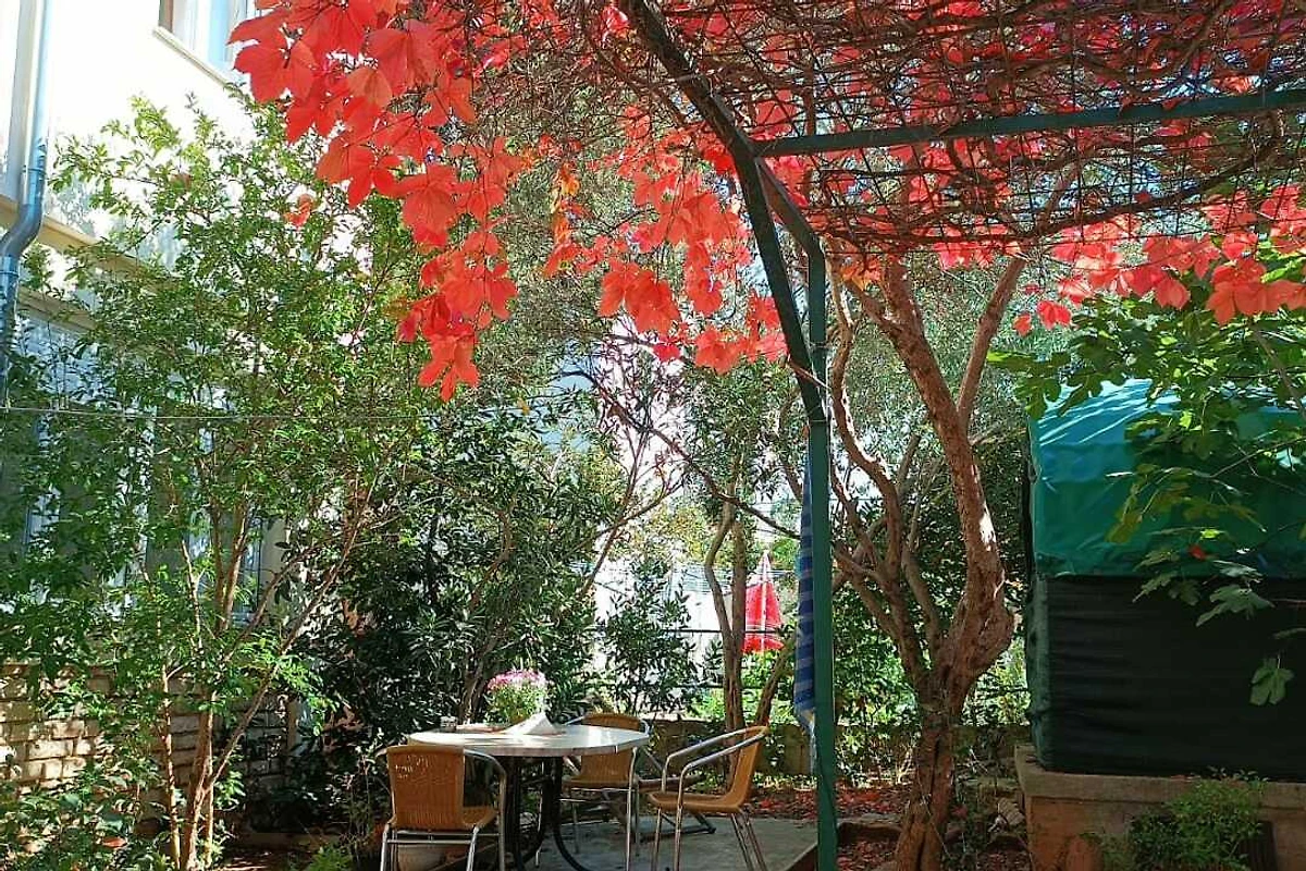 Es gibt zwei Terrassen zum geniessen und der Garten ist klein aber friedlich, normalerweise mit einer Katze irgendwo in der Sonne liegend. Immer ein schöner Ort um den Morgenkaffee zu geniessen.